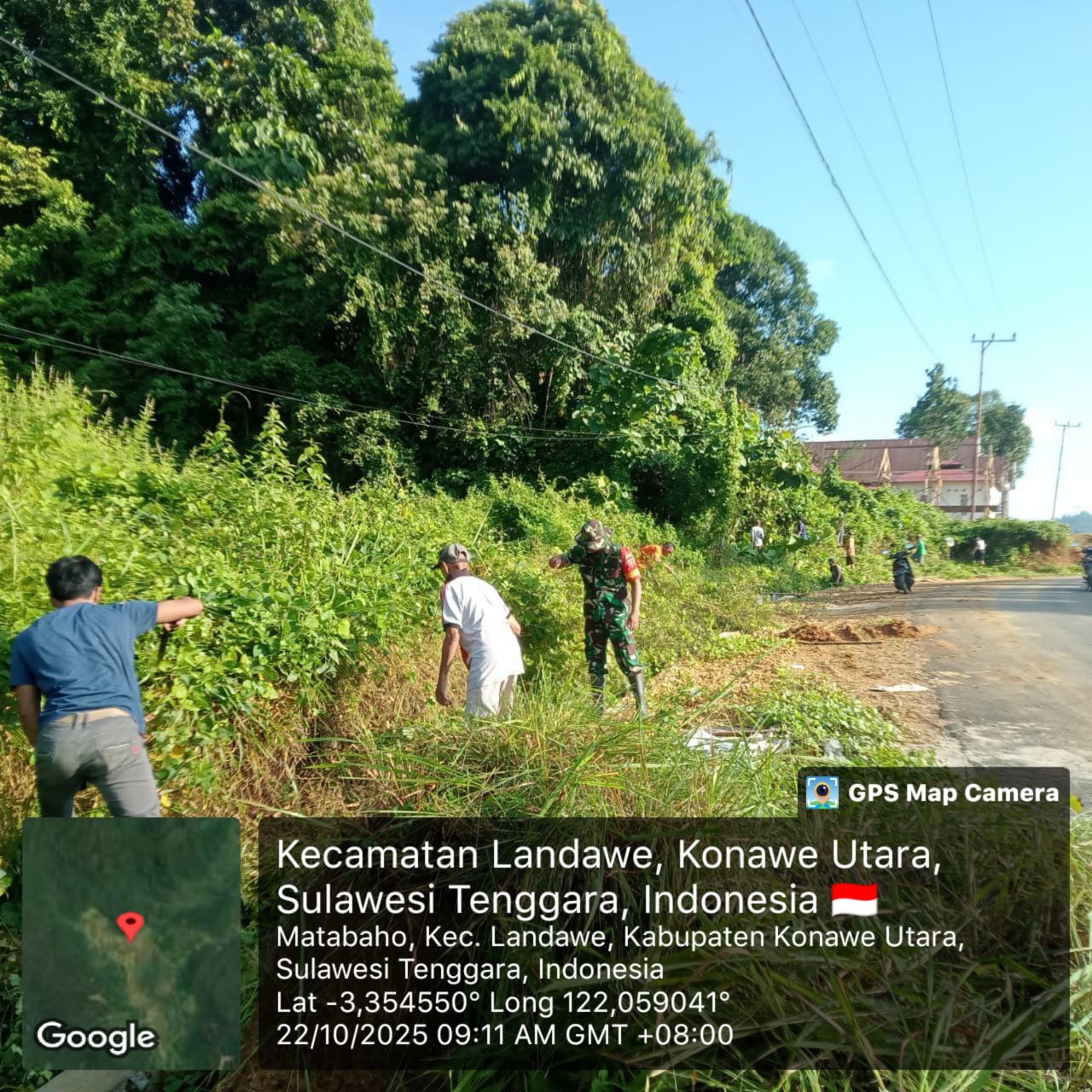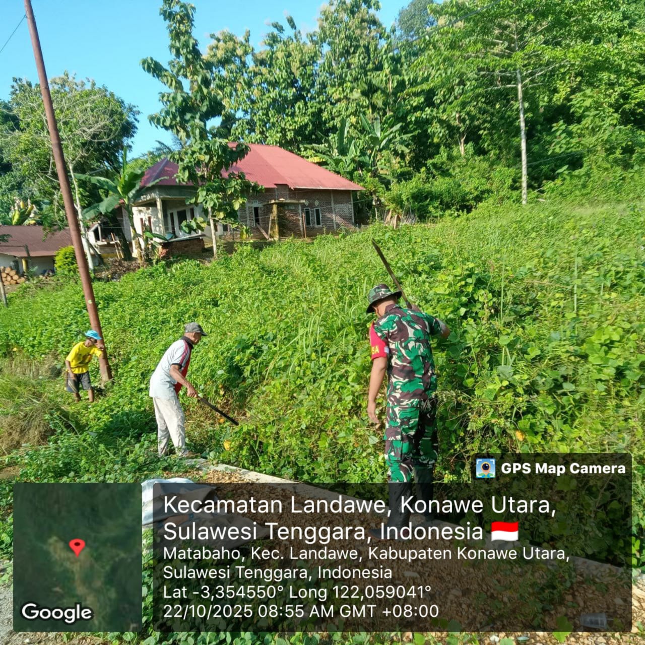 Konawe Utara – Dalam rangka menumbuhkan semangat gotong royong serta menjaga kebersihan lingkungan, Babinsa Koramil 1430-02/Asera, Serda La Arman, bersama masyarakat Desa Matabaho Kecamatan Landawe Kabupaten Konawe Utara, melaksanakan kegiatan Karya Bakti, Rabu (22/10/2025).