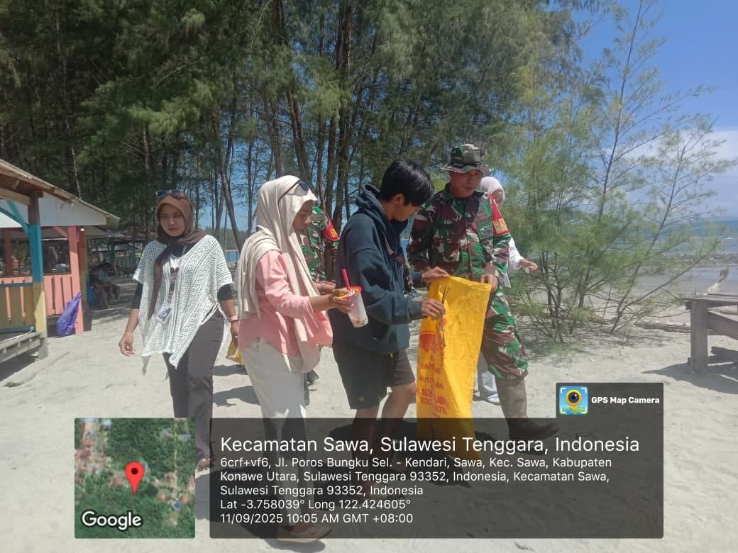 Babinsa Bersama Masyarakat dan Mahasiswa UNHALU Gelar Karya Bakti Pembersihan Pantai Walet