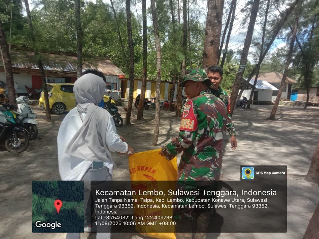 Konut – Dalam rangka penguatan teritorial dan pembinaan pemberdayaan wilayah, Babinsa Koramil 1430-01/Lasolo telah melaksanakan kegiatan karya bakti dengan sasaran pembersihan sampah di pesisir Pantai Walet, Desa Tudungano, Kecamatan Sawa, Kabupaten Konawe Utara, Sulawesi Tenggara Kamis (11/9/2025)