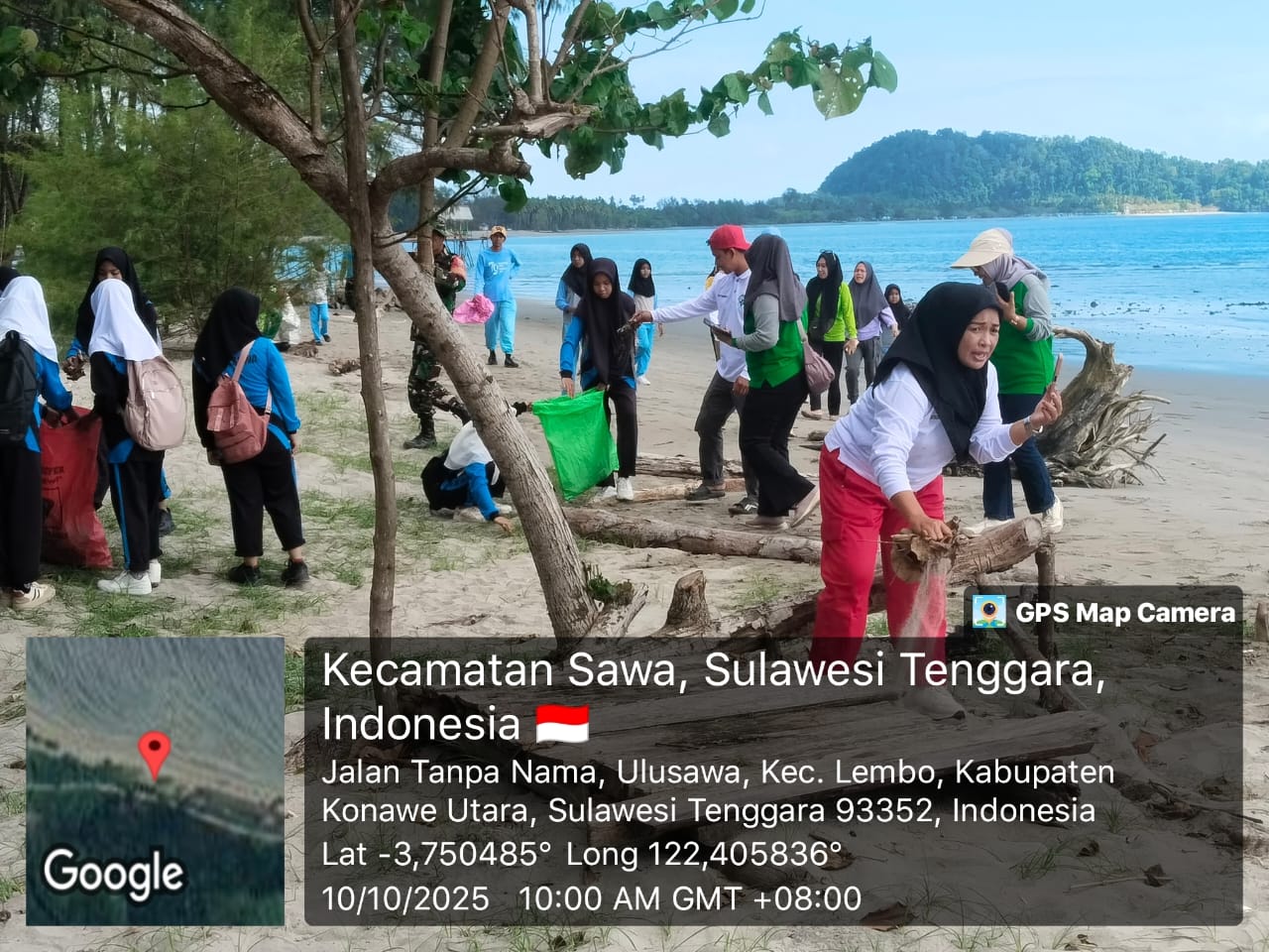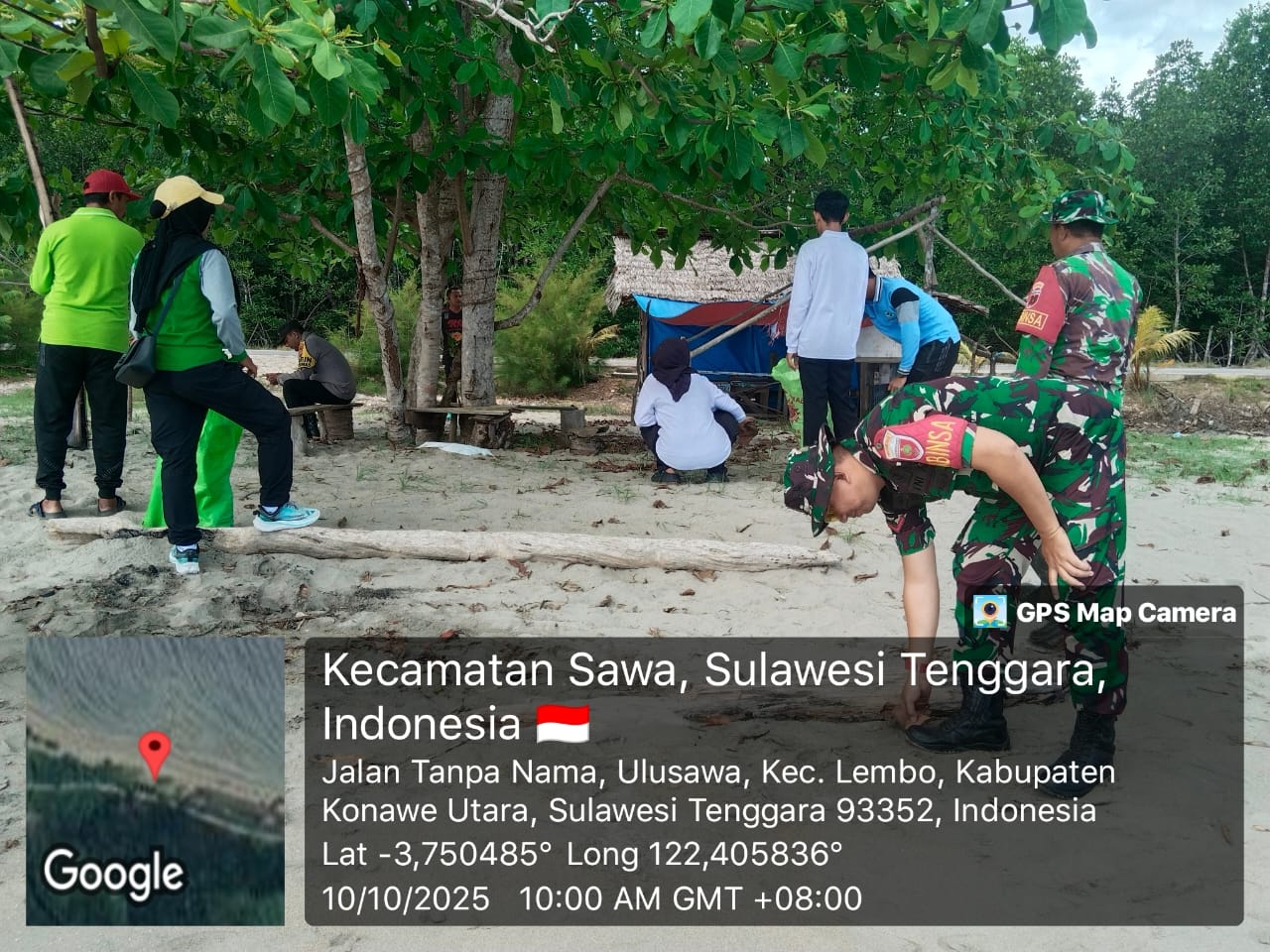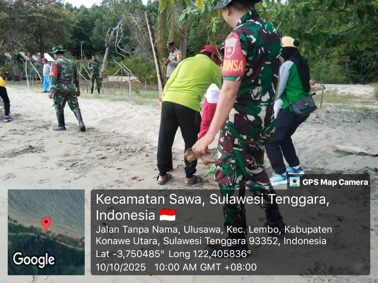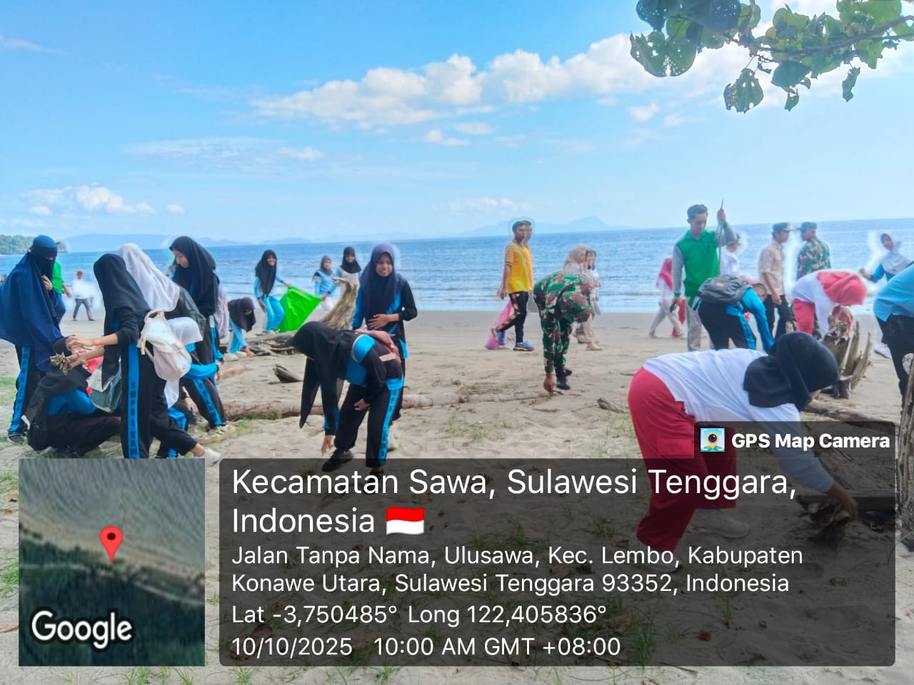 Konawe Utara– Dalam rangka menjaga kebersihan lingkungan dan menumbuhkan kesadaran masyarakat terhadap pentingnya menjaga kelestarian alam, Babinsa Koramil 1430-01/Lasolo Serma Ayub Masri bersama masyarakat Desa Ulu Sawa dan instansi terkait melaksanakan kegiatan karya bakti pembersihan pesisir Pantai Panggulawu, Kecamatan Sawa, Kabupaten Konawe Utara, Sulawesi Tenggara, pada Jumat (10/10/2025).