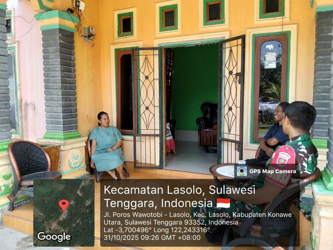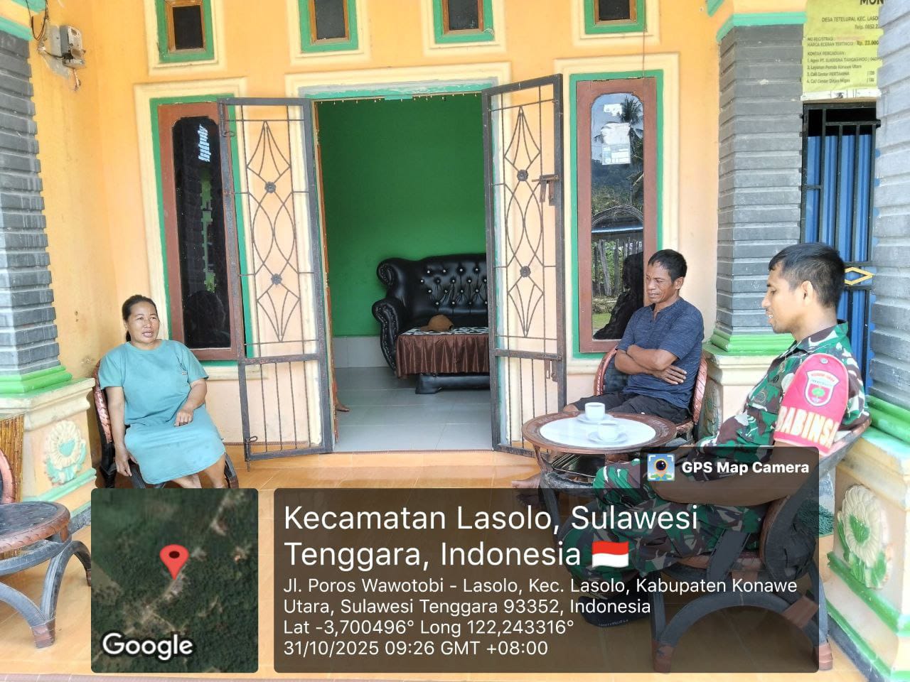 Konawe Utara – Dalam rangka mempererat hubungan antara TNI dan masyarakat, Babinsa Koramil 1430-01/Lasolo Serda Sarwan melaksanakan kegiatan pemantauan wilayah sekaligus Komunikasi Sosial (Komsos) bersama warga Desa Tetelupai, Kecamatan Lasolo, Kabupaten Konawe Utara, pada Jumat (31/10/2025) pukul 10.00 Wita.