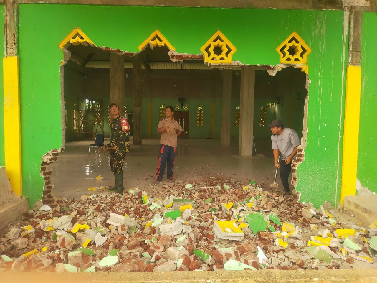 Kegiatan karya bakti ini difokuskan pada pembongkaran dan perbaikan bagian bangunan masjid yang mengalami kerusakan, khususnya pada dinding dan struktur dalam bangunan. Terlihat Babinsa bersama warga bahu-membahu membersihkan puing-puing bangunan, mengangkat material, serta menyiapkan area renovasi dengan penuh semangat dan kebersamaan.