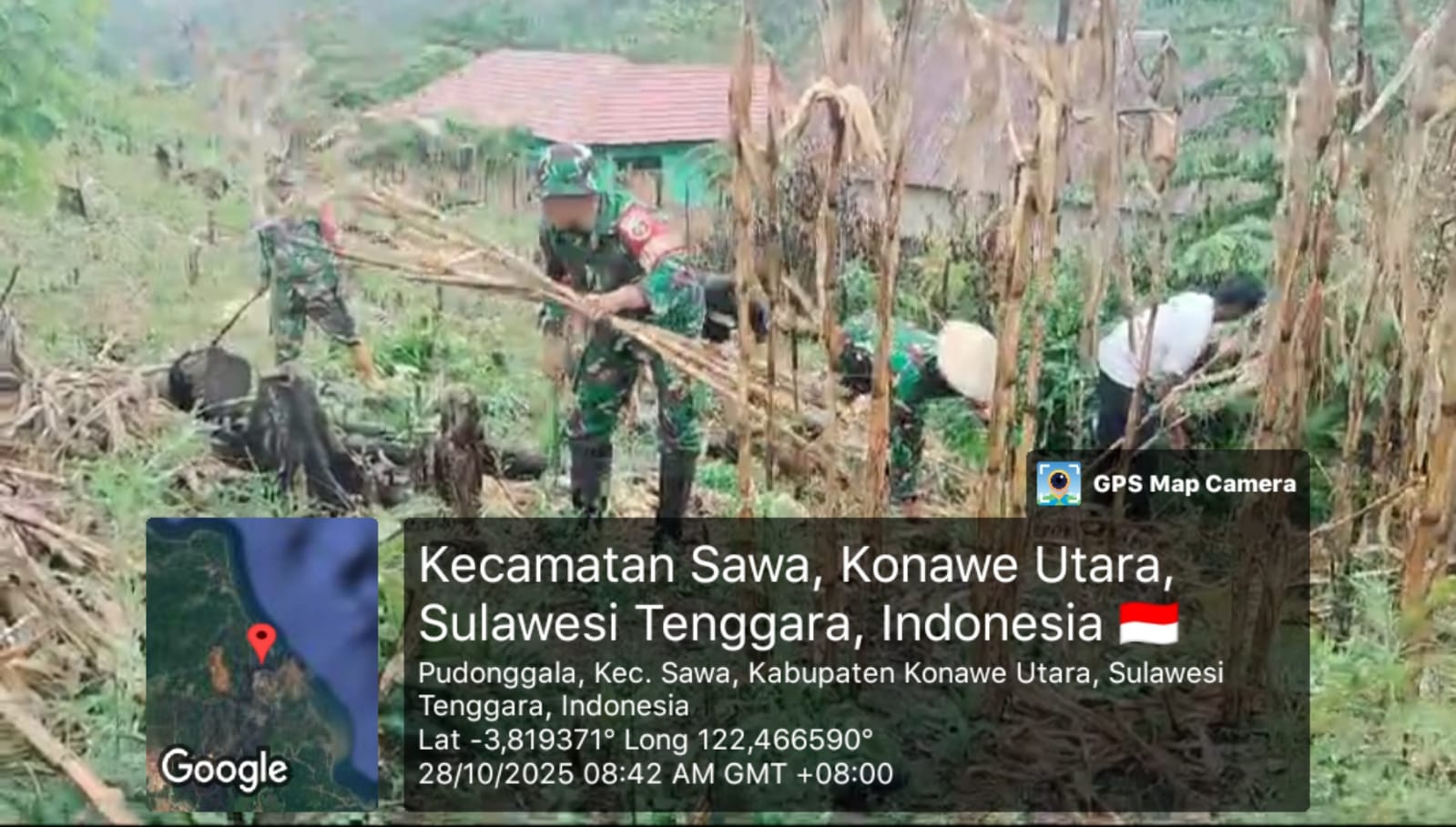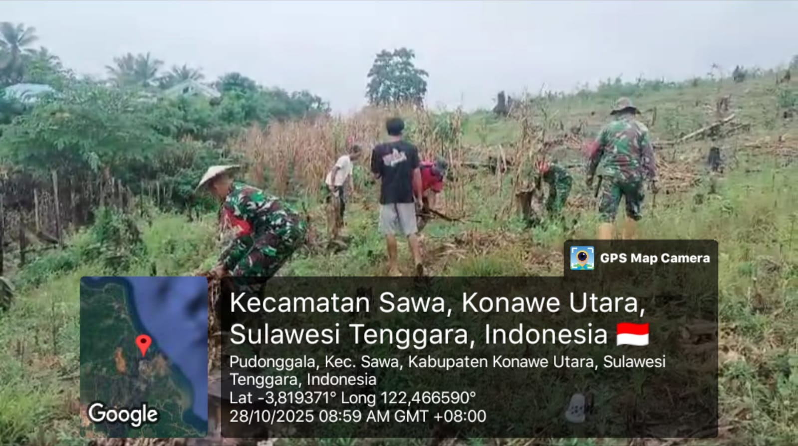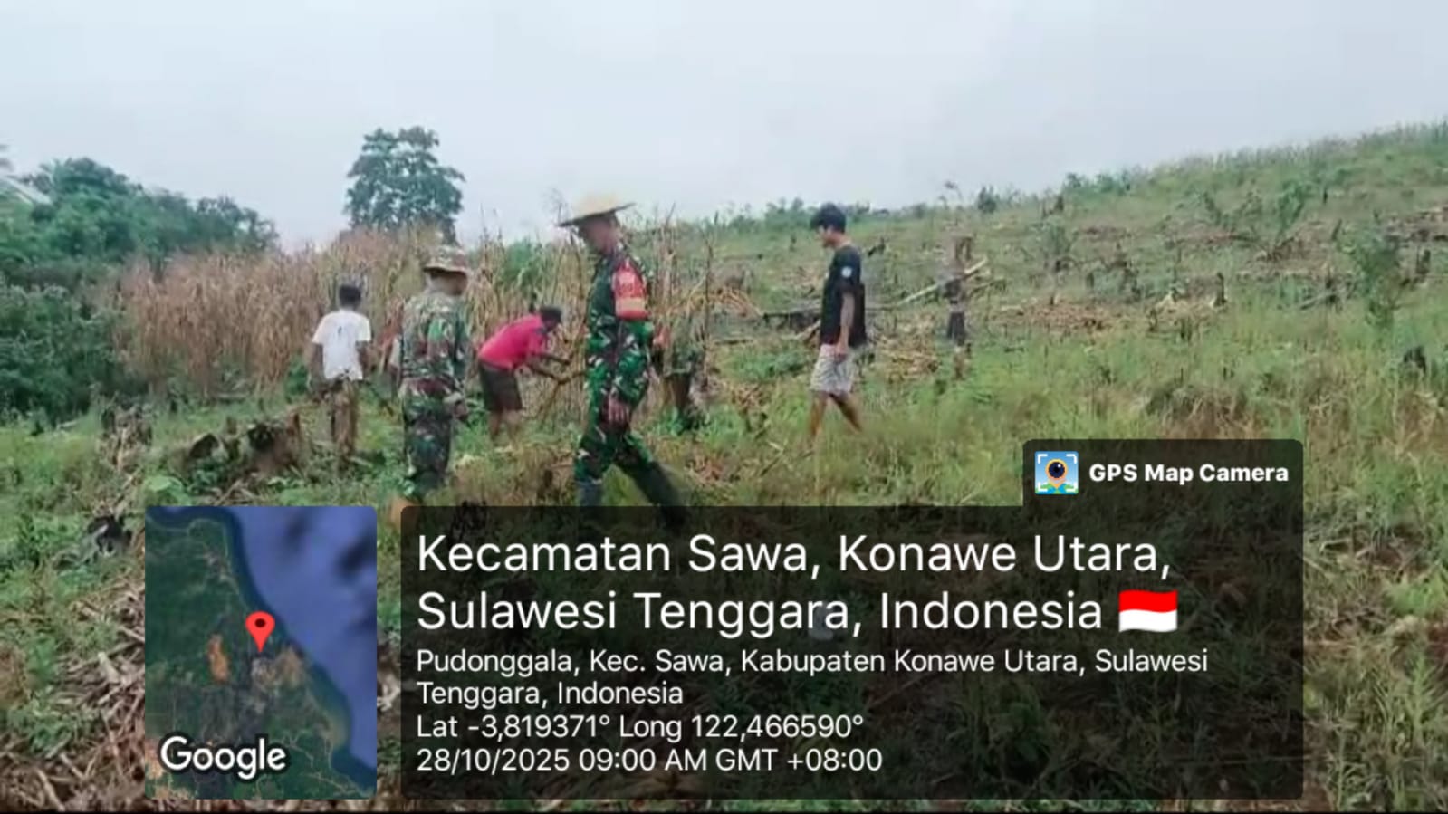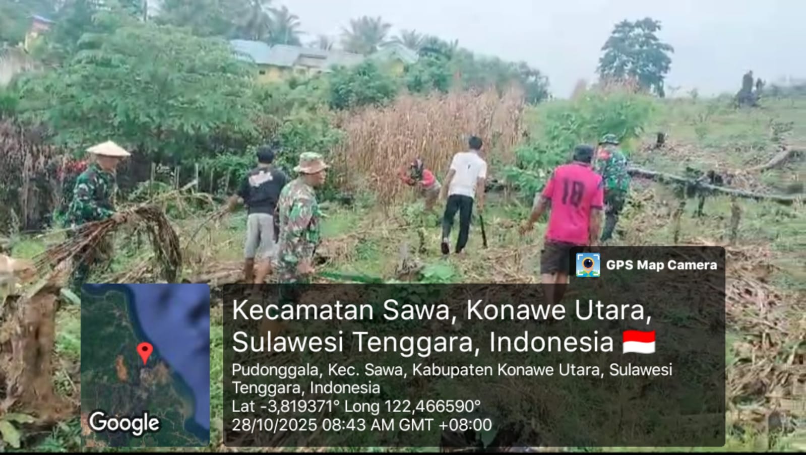 Konawe Utara — Dalam rangka menjaga kebersihan lingkungan dan mempererat kemanunggalan TNI dengan rakyat, Babinsa Koramil 1430-01/Lasolo, Kodim 1430/Konut melaksanakan kegiatan Karya Bakti bersama masyarakat di Desa Pudonggala, Kecamatan Sawa, Kabupaten Konawe Utara, Selasa (28/10/2025).