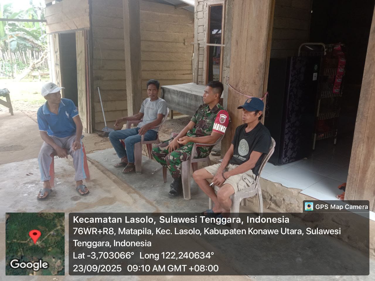 Konawe Utara – Dalam rangka mempererat silaturahmi dan meningkatkan kedekatan dengan masyarakat, Babinsa Koramil 1430-01/Lasolo, Serda Sarwan, melaksanakan kegiatan pemantauan wilayah sekaligus komunikasi sosial (Komsos) bersama warga Desa Matapila, Kecamatan Lasolo Kepulauan, pada Selasa (23/9/2025).