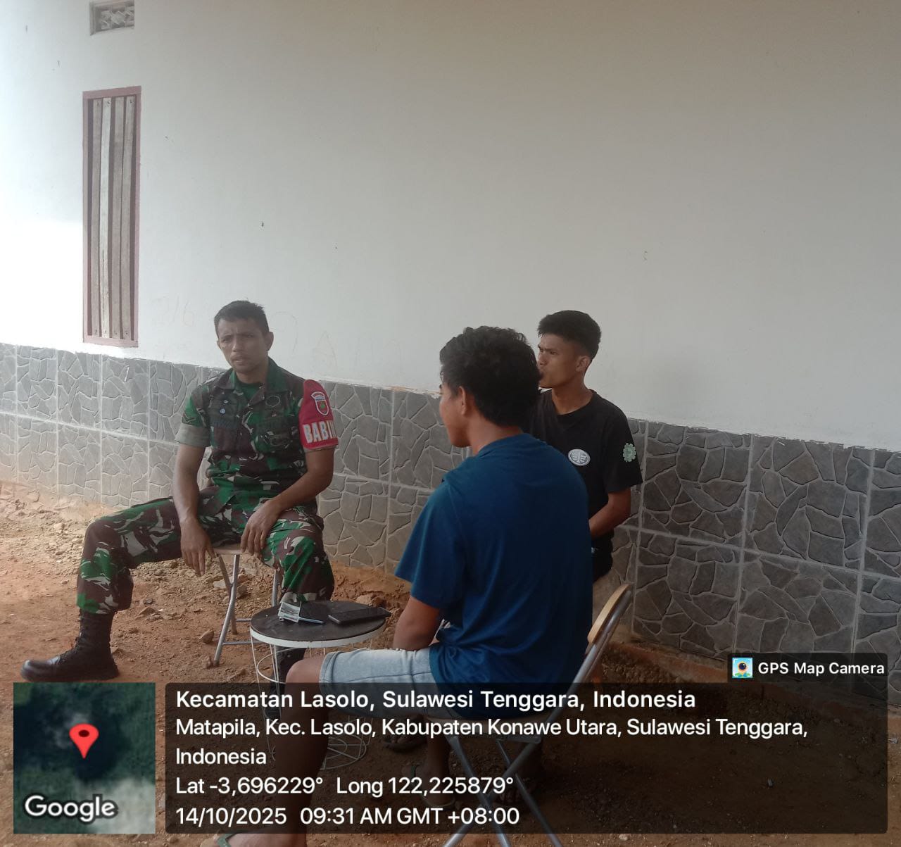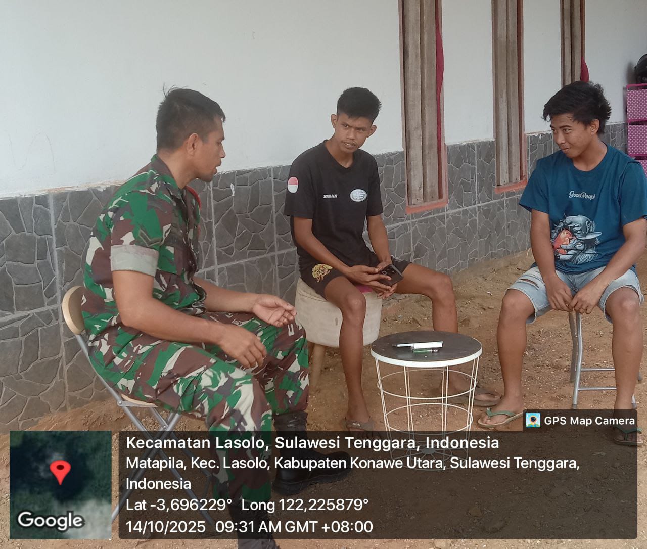 Konawe Utara – Dalam rangka mempererat hubungan dengan masyarakat di wilayah binaannya, Babinsa Koramil 1430-01/Lasolo, Serda Sarwan, melaksanakan kegiatan Komunikasi Sosial (Komsos) sekaligus pemantauan wilayah di Desa Matapila, Kecamatan Lasolo, Kabupaten Konawe Utara, pada Selasa (14/10/2025)