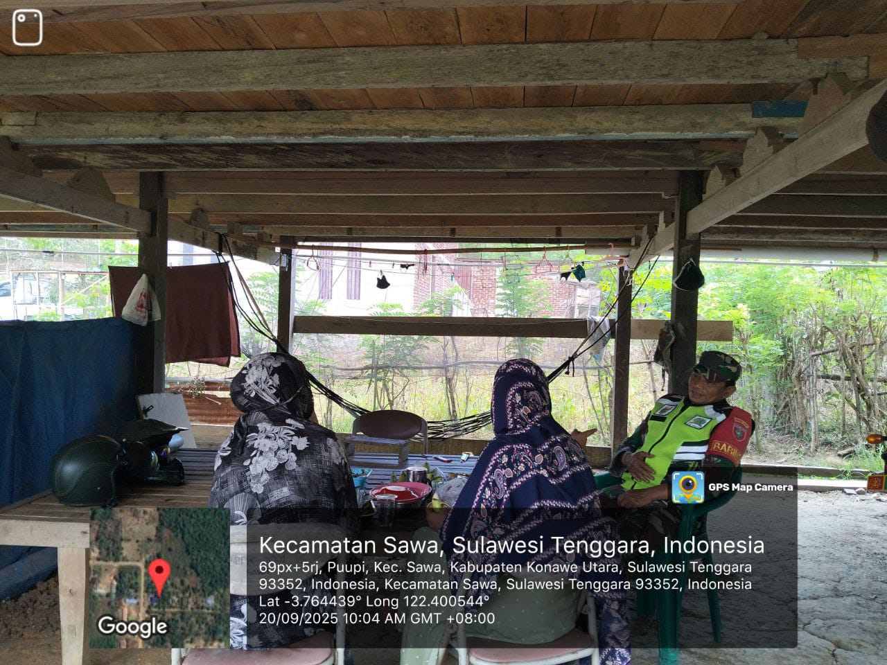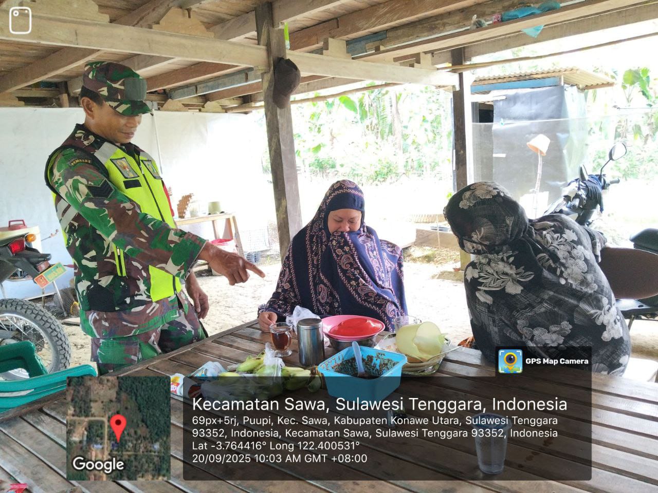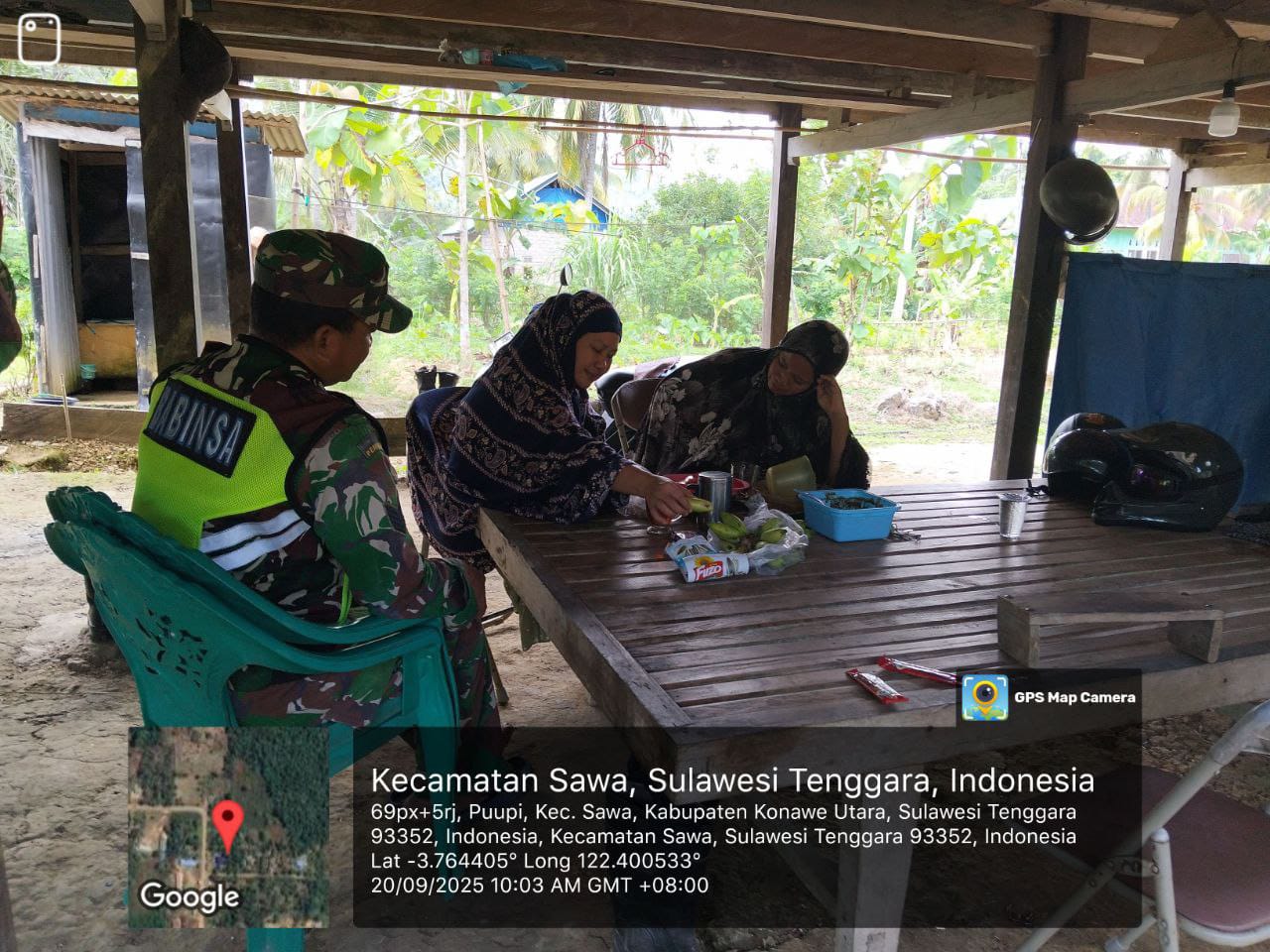 Konawe Utara – Dalam rangka penguatan teritorial dan pembinaan pemberdayaan wilayah, Babinsa Koramil 1430-01/Lasolo, Serma Ayyub Masri melaksanakan kegiatan komunikasi sosial (Komsos) bersama warga Desa Puupi, Kecamatan Sawa, Kabupaten Konawe Utara Sabtu (20/9/2025)