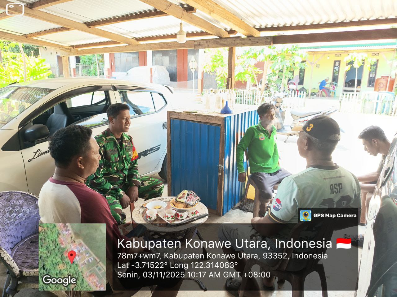 Konawe Utara — Dalam rangka mempererat hubungan dengan masyarakat di wilayah binaannya, Serda Darmin, Babinsa Koramil 1430-01/Lasolo, melaksanakan kegiatan pemantauan wilayah sekaligus komunikasi sosial (Komsos) bersama warga Desa Kampoh Cina, Kecamatan Wawolesea, Kabupaten Konawe Utara Senin (3/11/2025) pada pukul 10.00 Wita.