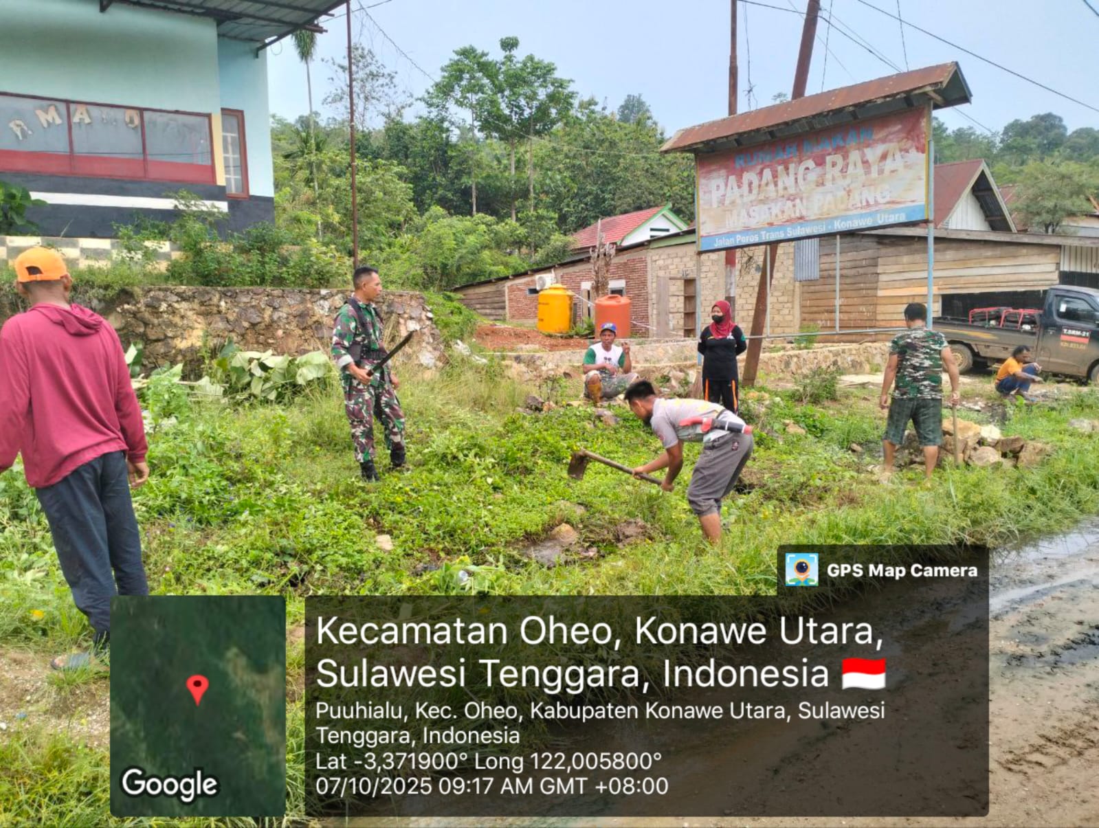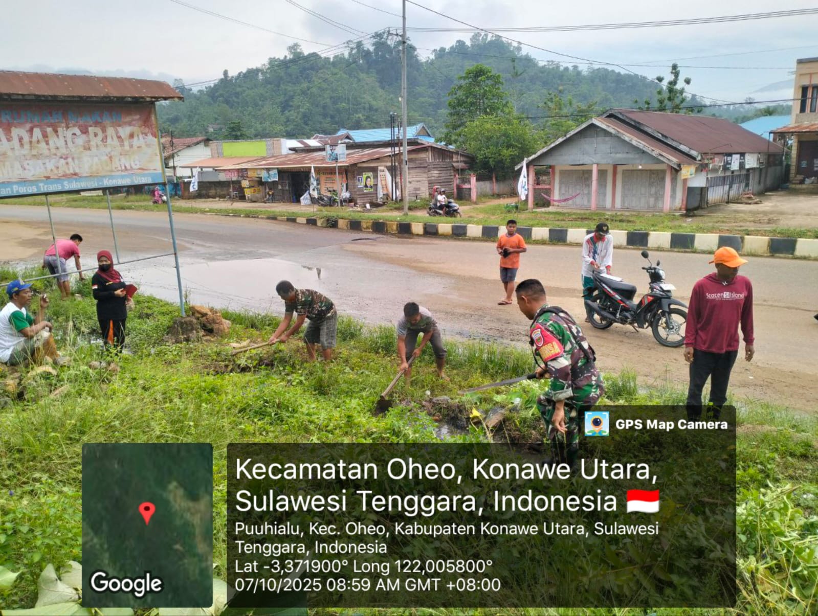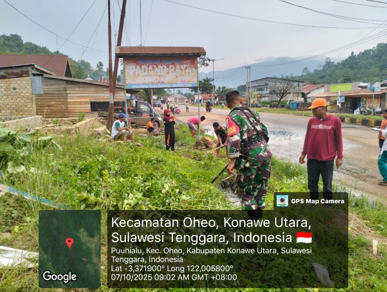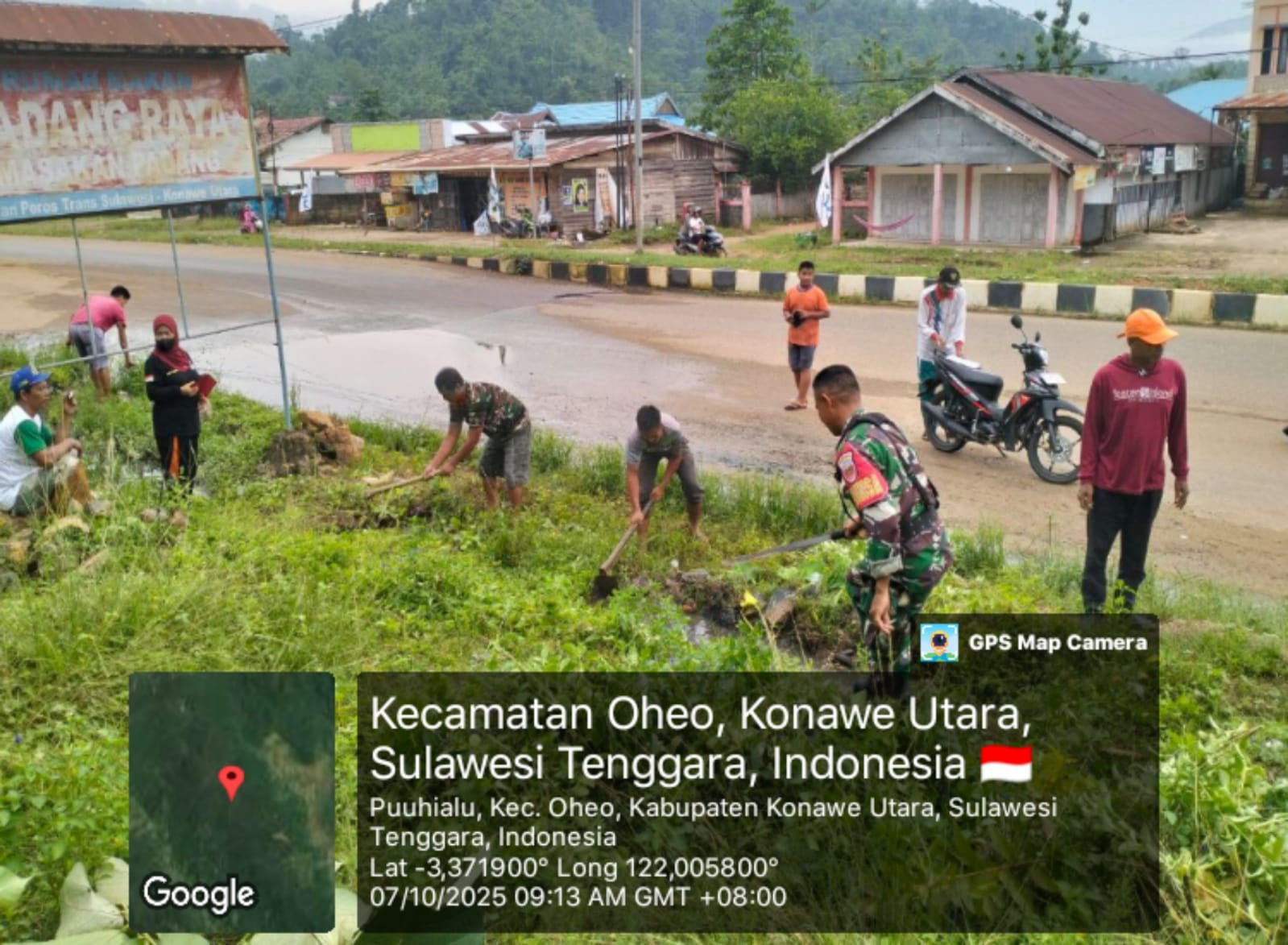 Konawe Utara – Dalam rangka menjaga kebersihan lingkungan sekaligus mencegah terjadinya banjir saat musim hujan, Babinsa Koramil 1430-02/Asera, Serka Akhiruddin, bersama warga melaksanakan karya bakti pembersihan saluran drainase di Desa Puuhialu, Kecamatan Oheo, Kabupaten Konawe Utara, pada Selasa (7/10/2025)