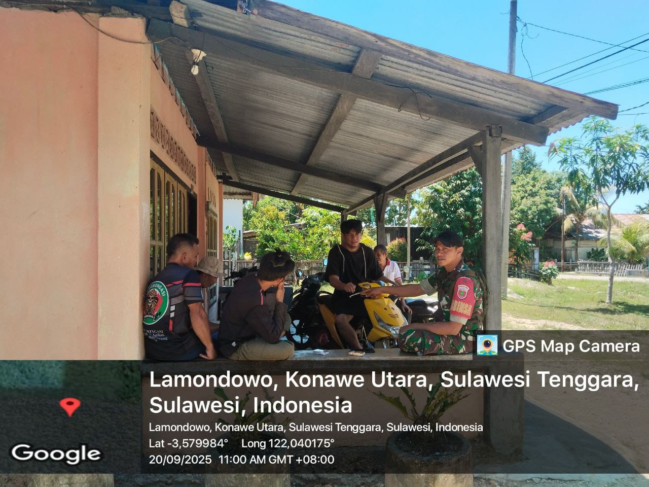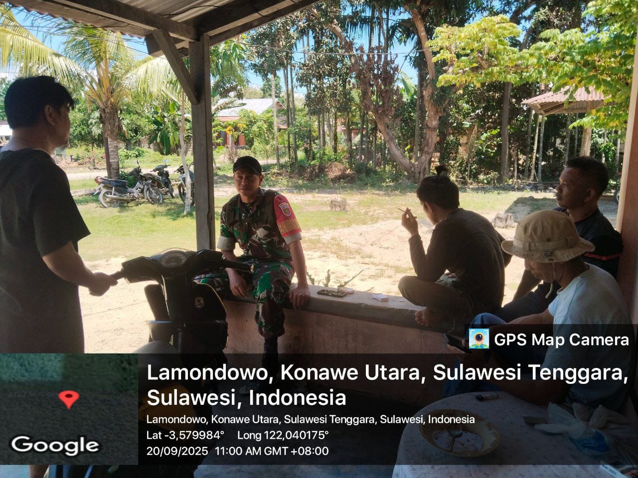 Konawe Utara – Dalam rangka penguatan teritorial dan pembinaan pemberdayaan wilayah, Babinsa Koramil 1430-02/Asera, Serda Al Ihsan melaksanakan kegiatan Komunikasi Sosial (Komsos) bersama warga Desa Lamondowo, Kecamatan Andowia, Kabupaten Konawe Utara Sabtu (20/9/2025)