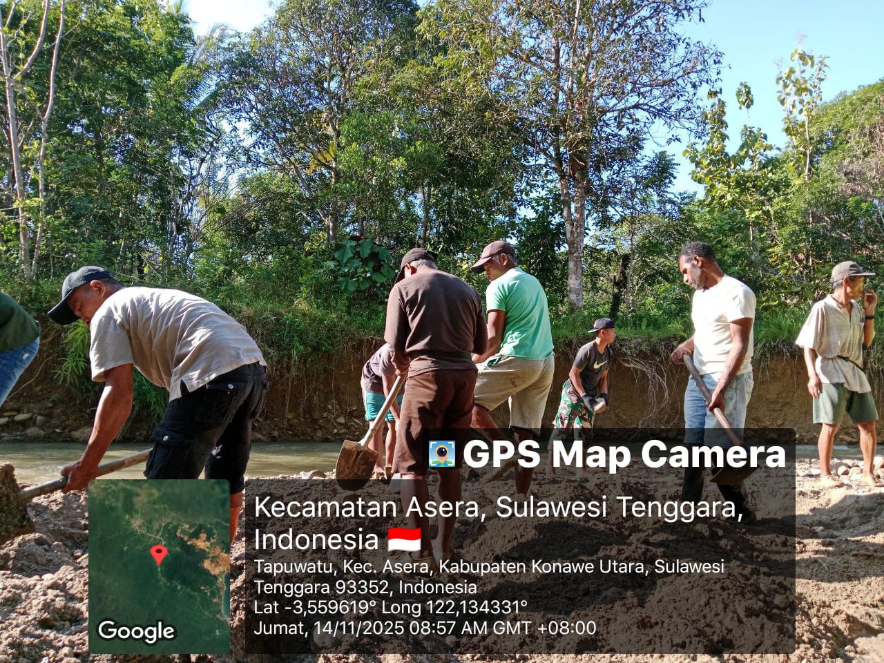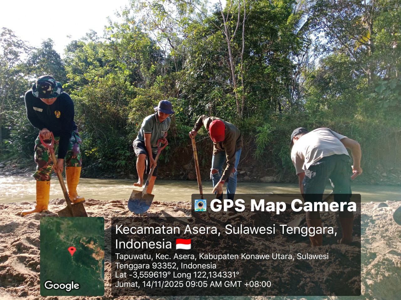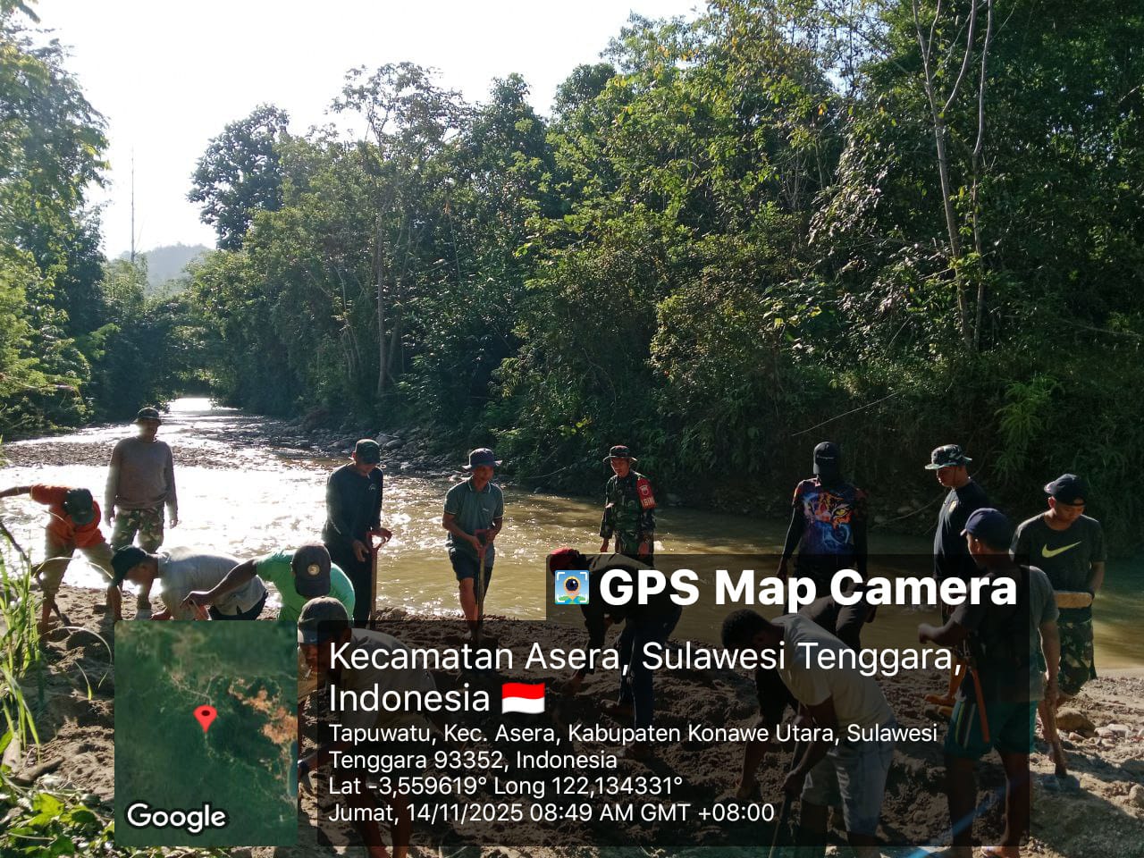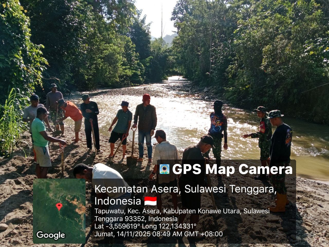 Konawe Utara – Dalam upaya menjaga kelestarian lingkungan serta mencegah potensi banjir di wilayah binaan, Babinsa Koramil 1430-02/Asera, Serda N. Damar, bersama masyarakat Desa Tapuwatu melaksanakan kegiatan Karya Bakti pembersihan aliran sungai, Jumat (14/11/2025).