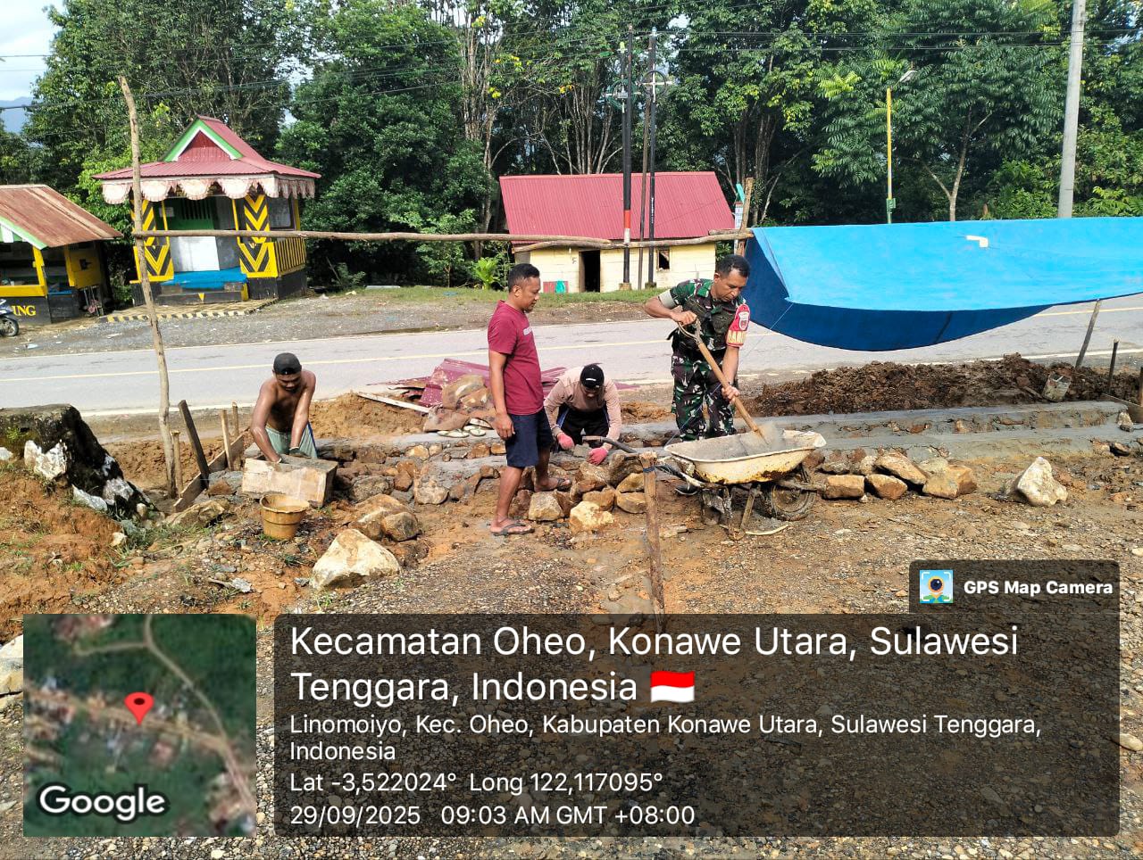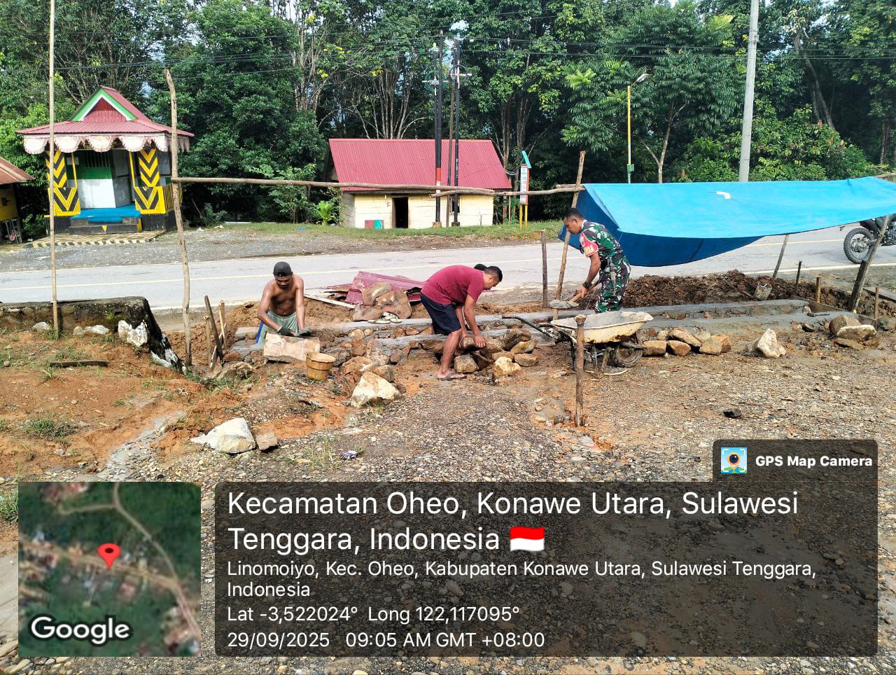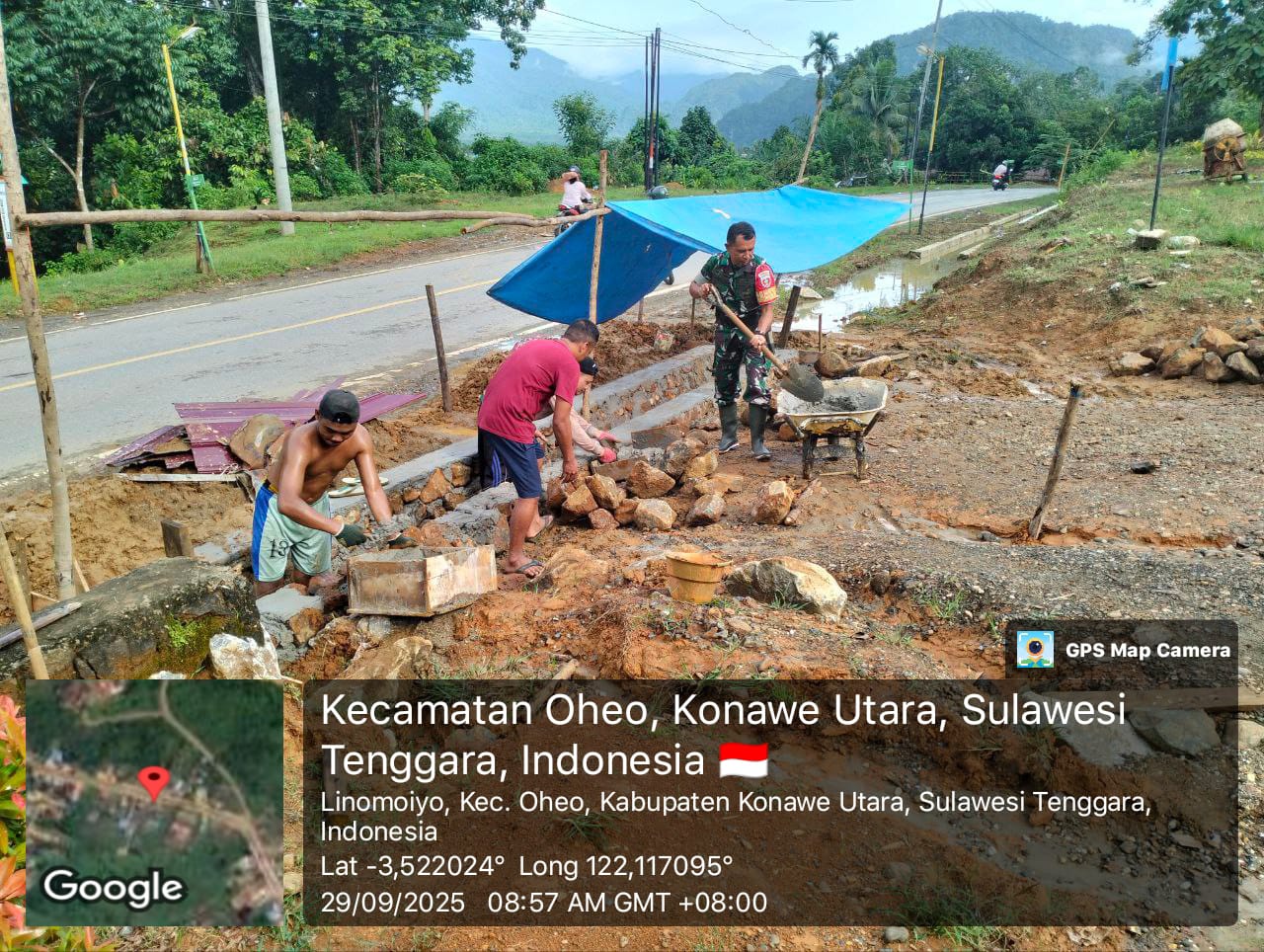 Konawe Utara – Dalam rangka menjaga kebersihan lingkungan dan mencegah terjadinya banjir, Babinsa Koramil 1430-02/Asera, Serka Ahiruddin, bersama warga Desa Linomoiyo, Kecamatan Oheo, melaksanakan kegiatan karya bakti pembuatan drainase, Senin (29/9/2025).