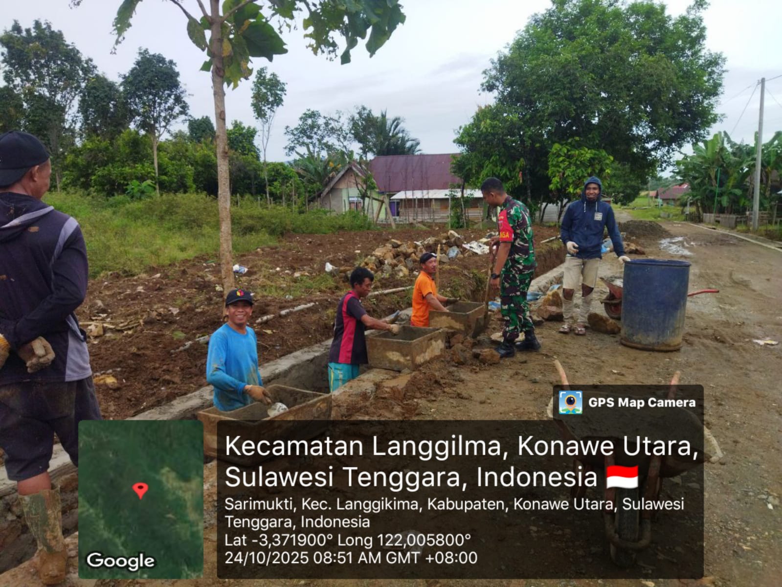 Konawe Utara – Dalam rangka meningkatkan kepedulian terhadap lingkungan serta mencegah terjadinya banjir dan genangan air, Babinsa Koramil 1430-02/Asera, Kopda Afrisal, melaksanakan kegiatan Karya Bakti pembuatan drainase bersama masyarakat di Desa Sarimukti, Kecamatan Langgikima, Kabupaten Konawe Utara, pada Jumat (24/10/2025).