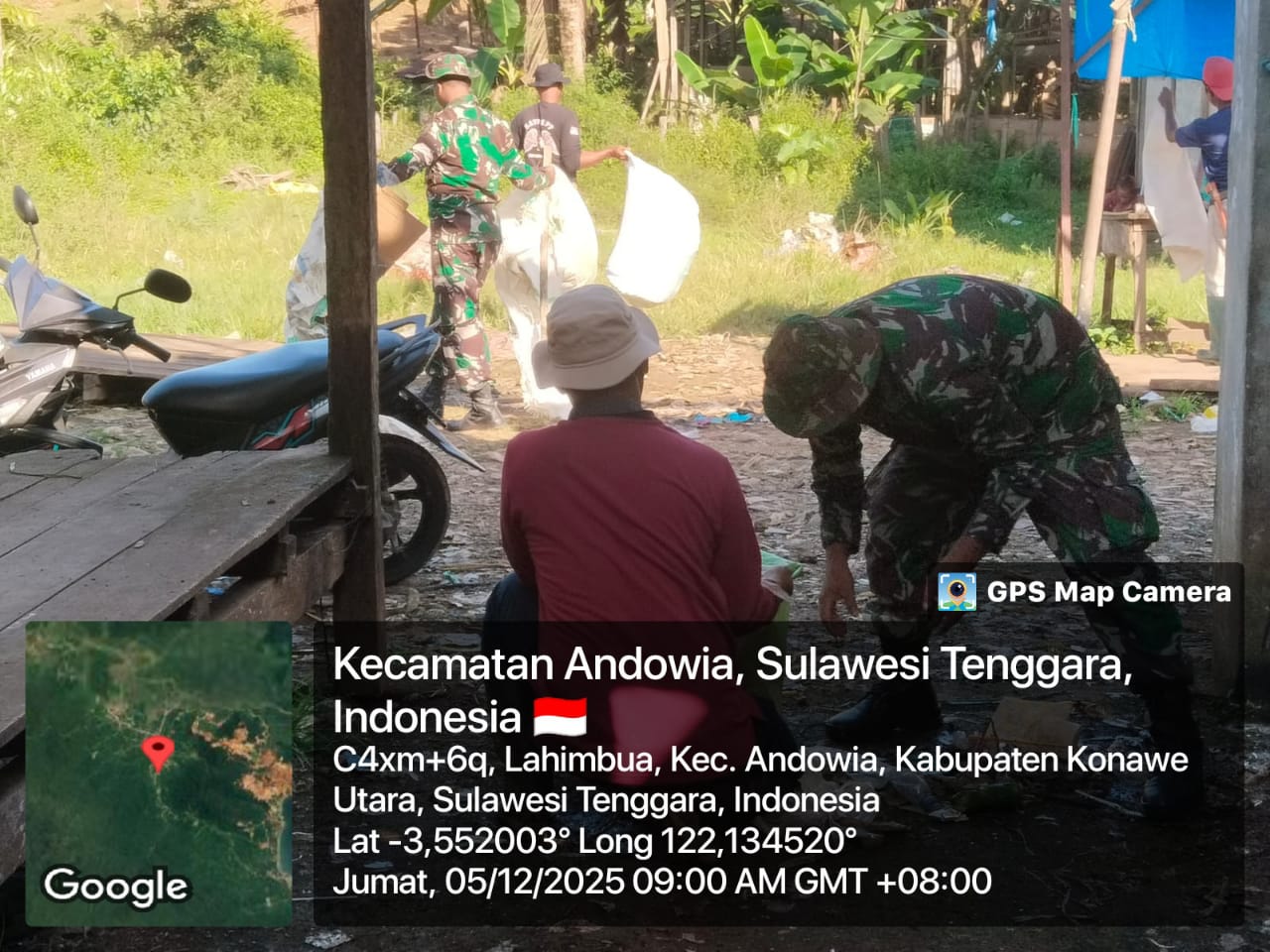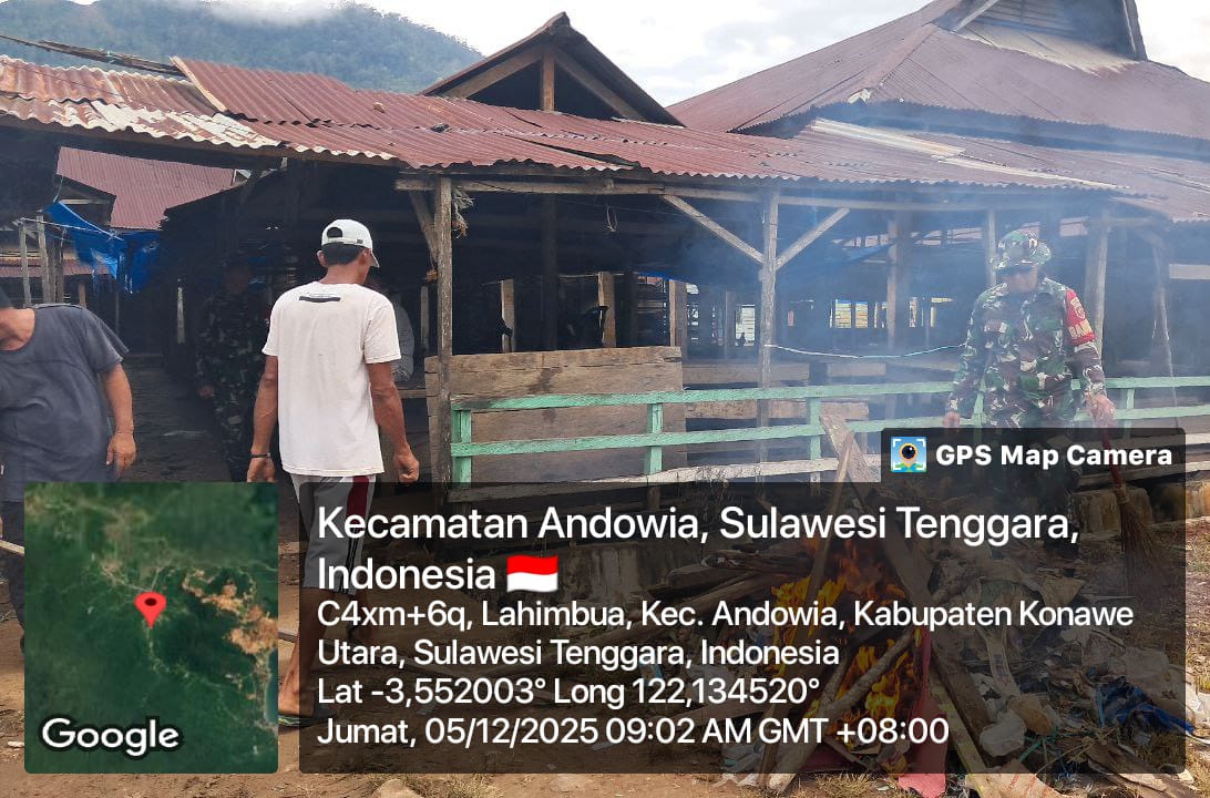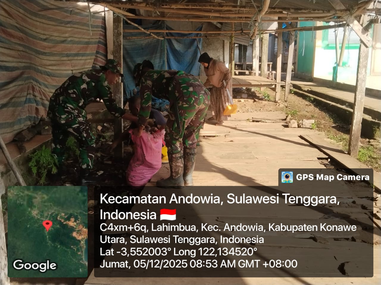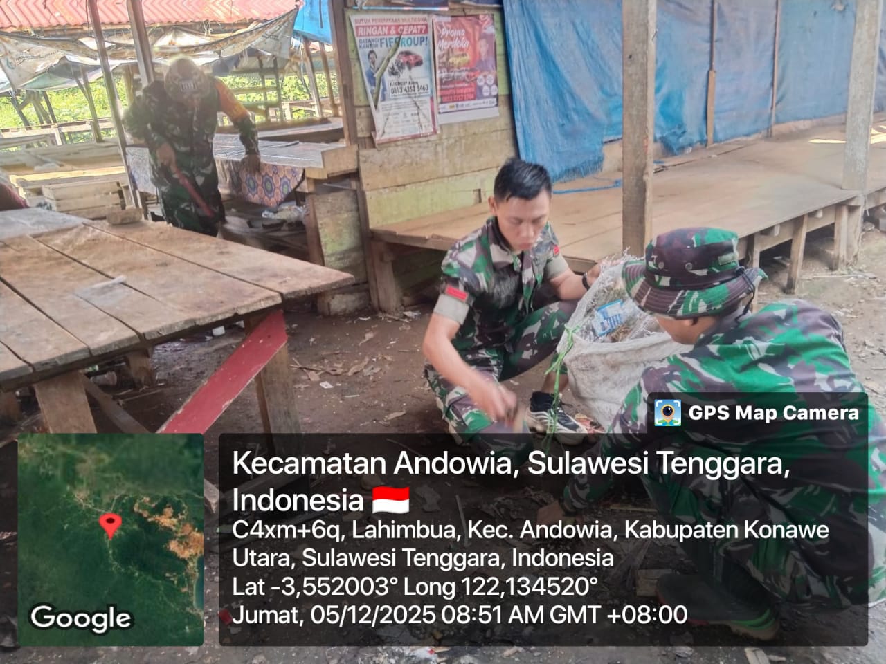 Konawe Utara – Dalam rangka meningkatkan kebersihan lingkungan serta mempererat kemanunggalan TNI dengan rakyat, Babinsa Koramil 1430-02/Asera melaksanakan kegiatan Karya Bakti bersama masyarakat di pasar tradisional Desa Lahimbua, Kecamatan Andowia, Kabupaten Konawe Utara, pada Jumat (5/12/2025) pukul 08.30 Wita.