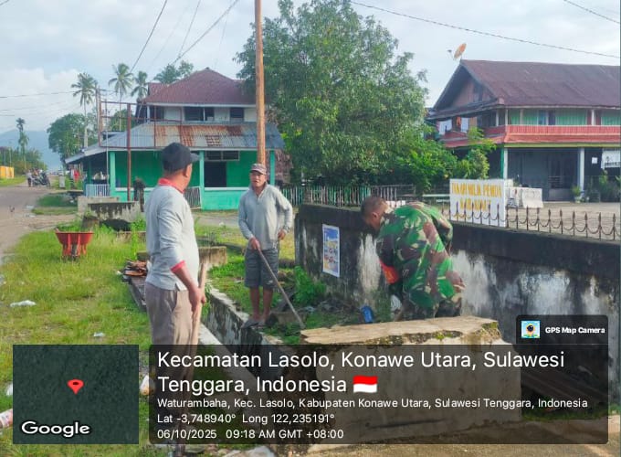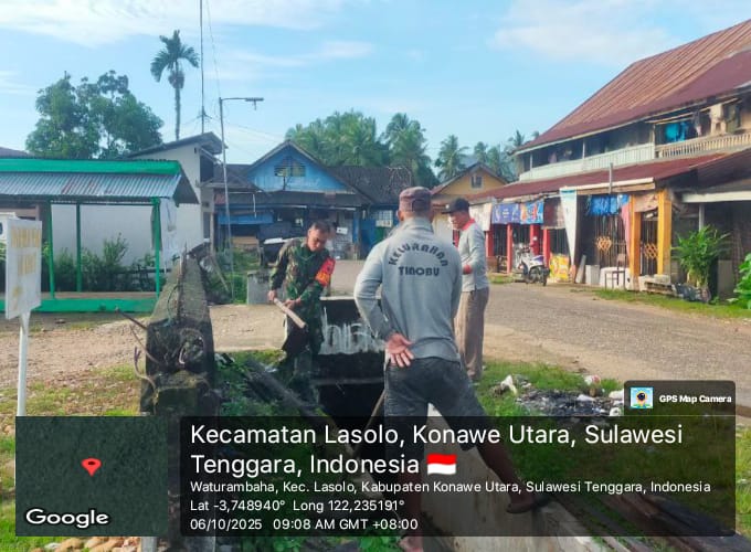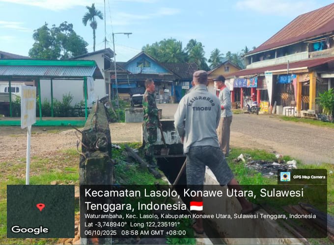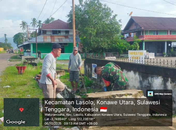 Konawe Utara – Dalam upaya menjaga kebersihan lingkungan dan mencegah terjadinya banjir di wilayah binaannya, Babinsa Koramil 1430-01/Lasolo, Serda Misbahul melaksanakan kegiatan karya bakti bersama masyarakat membersihkan saluran drainase di Desa Waturambaha, Kecamatan Lasolo, Kabupaten Konawe Utara, pada Senin (6/10/2025).