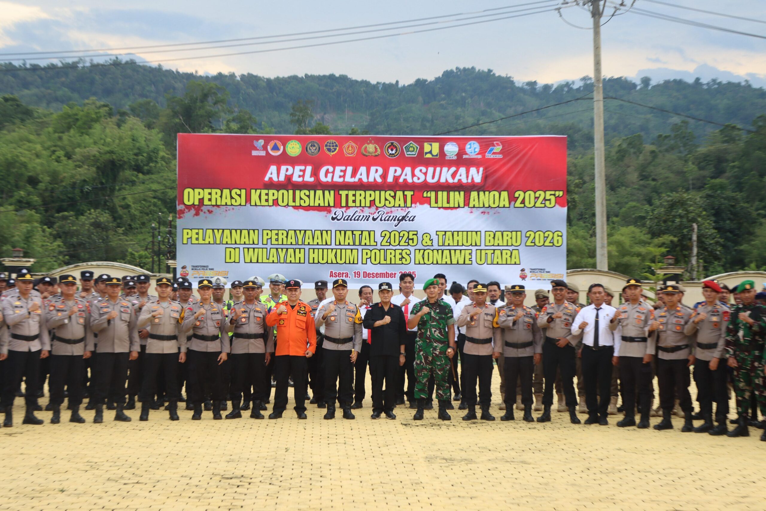 Konawe Utara – Dandim 1430/Konawe Utara Letkol Kav Kuswara, S.I.P. menghadiri sekaligus mengikuti Apel Gelar Pasukan Operasi “Lilin Anoa–2025” dalam rangka pengamanan Perayaan Natal Tahun 2025 dan Tahun Baru 2026, yang diselenggarakan oleh Polres Konawe Utara. Kegiatan tersebut berlangsung di Lapangan Upacara Polres Konawe Utara, Kelurahan Wanggudu, Kecamatan Asera, Kabupaten Konawe Utara, Provinsi Sulawesi Tenggara, Jumat (19/12/2025).