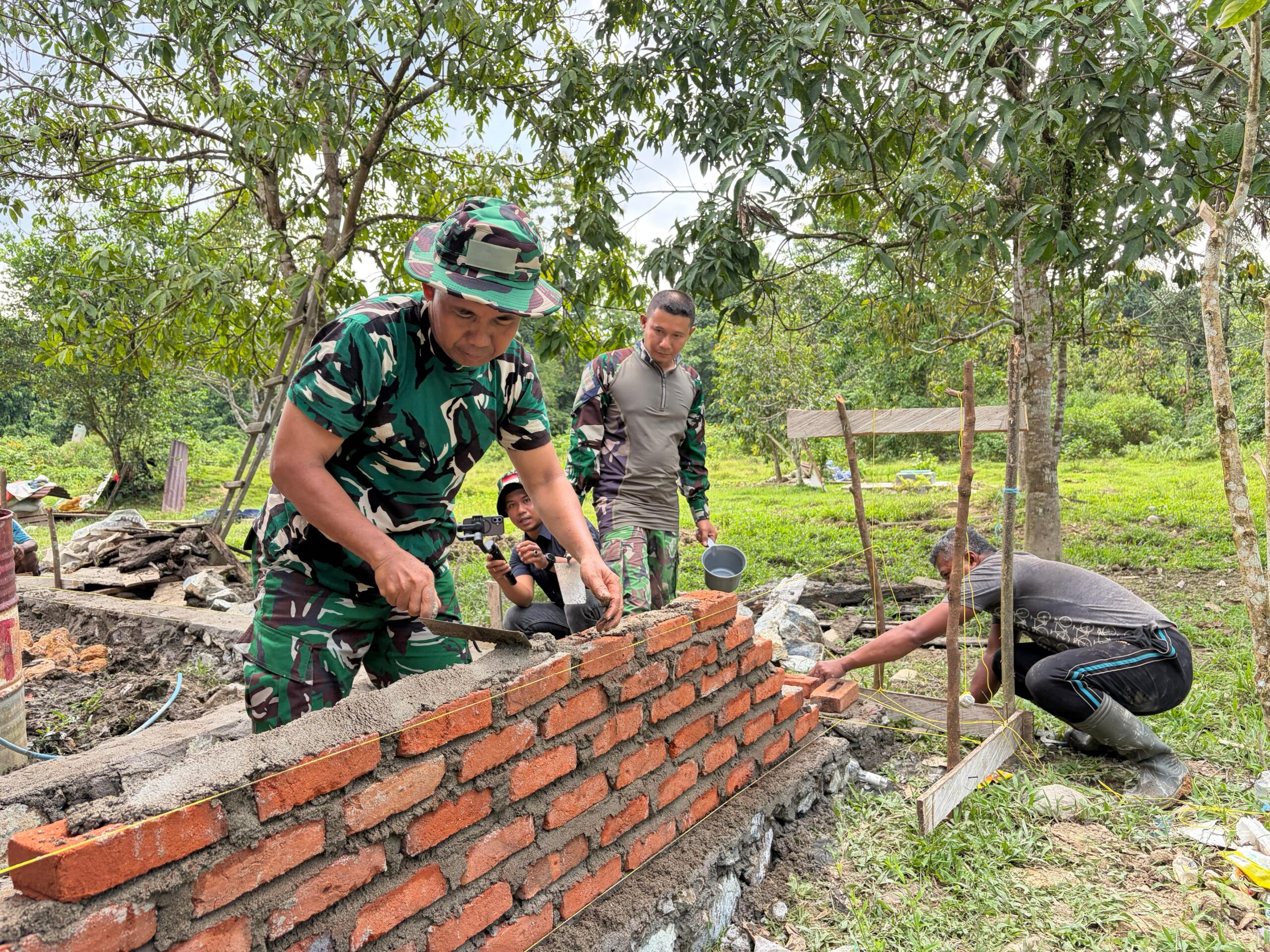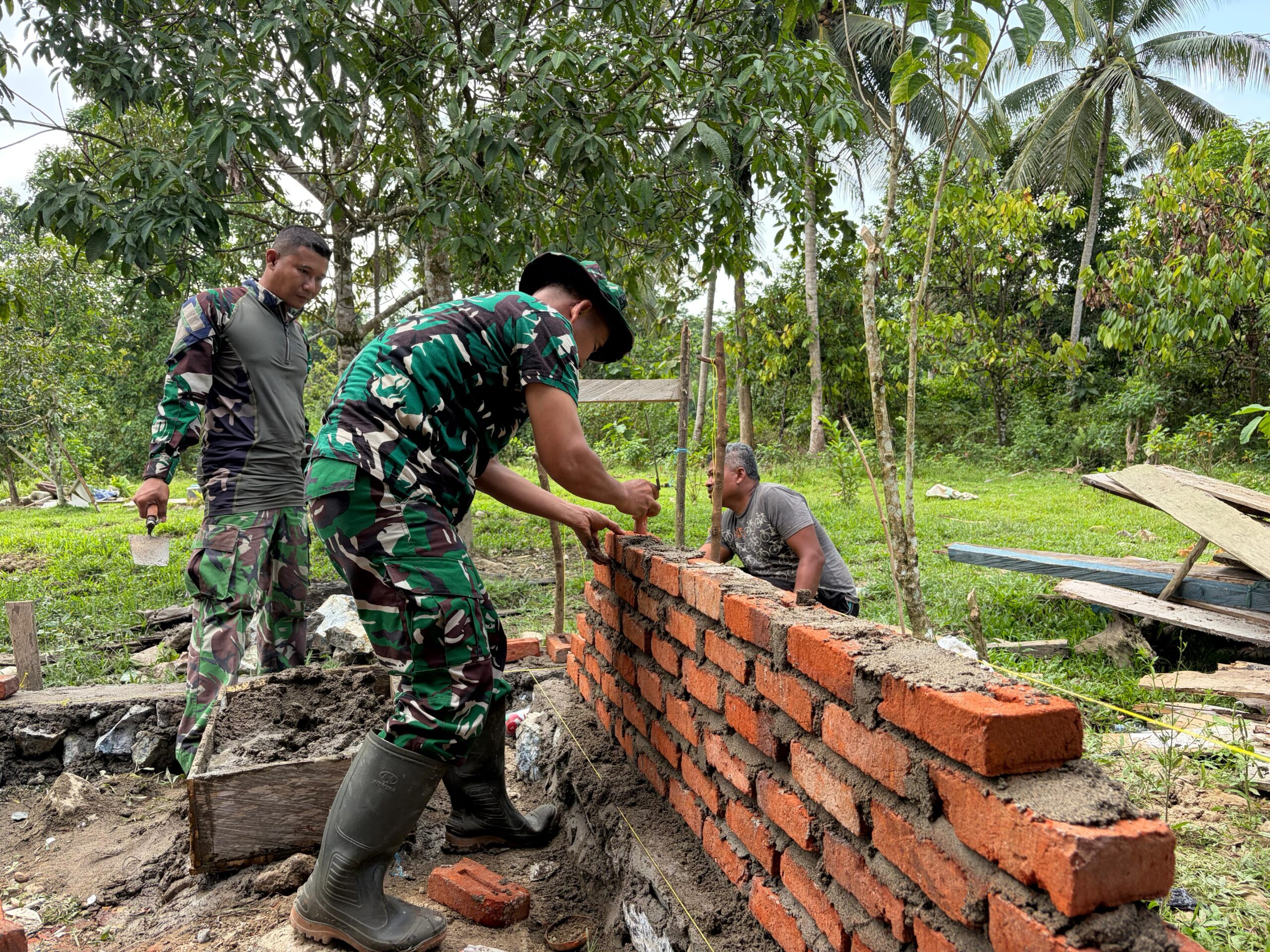 Dalam suasana kebersamaan yang hangat, terlihat Mayor Mapatoba dengan penuh fokus meratakan adukan semen di atas susunan bata, memastikan setiap bagian terpasang rapi dan kokoh. Di sisi lain, warga turut aktif membantu, mulai dari menyiapkan material hingga mengukur posisi bangunan agar sesuai dengan perencanaan.