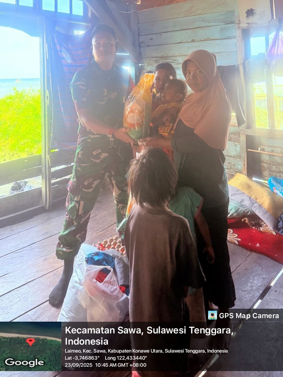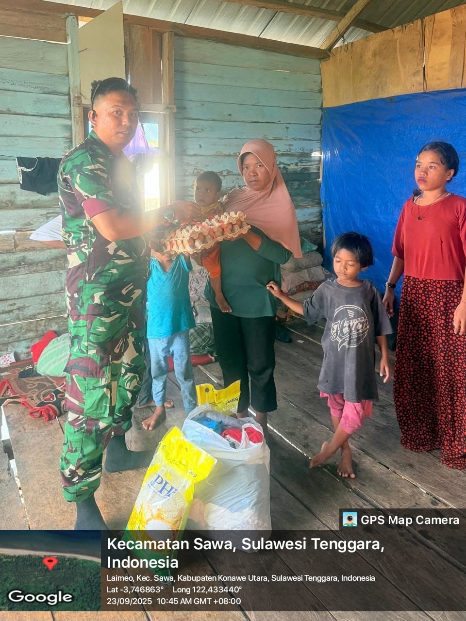Kegiatan berlangsung di Desa Laimeo, Kecamatan Sawa, Kabupaten Konawe Utara, dengan dihadiri Babinsa Koramil 1430-01/Lasolo, Serda Ansar dan Kopda Ahdar Rasak. Paket sembako yang dibagikan berupa beras 10 kg, minyak goreng 1 liter, telur 4 rak, serta pakaian layak pakai.