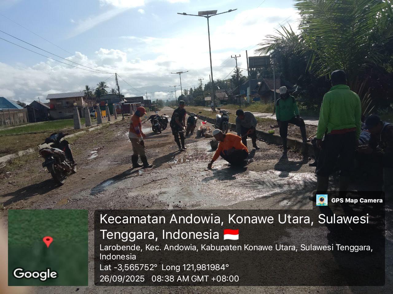 Adapun sasaran Karya Bakti kali ini meliputi perbaikan jalan aspal yang mengalami kerusakan dan berlubang di Kelurahan Andowia, serta pembersihan sampah di area pemukiman dan fasilitas umum.