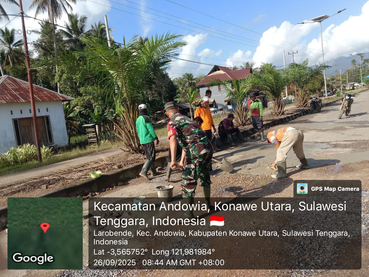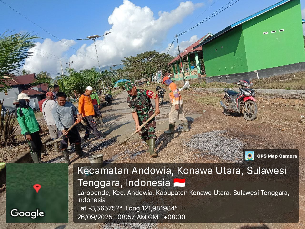 Konawe Utara – Dalam rangka menjaga kebersihan lingkungan dan meningkatkan kepedulian masyarakat terhadap fasilitas umum, Babinsa Koramil 1430-02/Asera Serka Ruslin bersama warga Desa Larobende, Kecamatan Andowia, melaksanakan kegiatan Karya Bakti pada Jumat (26/9/2025).