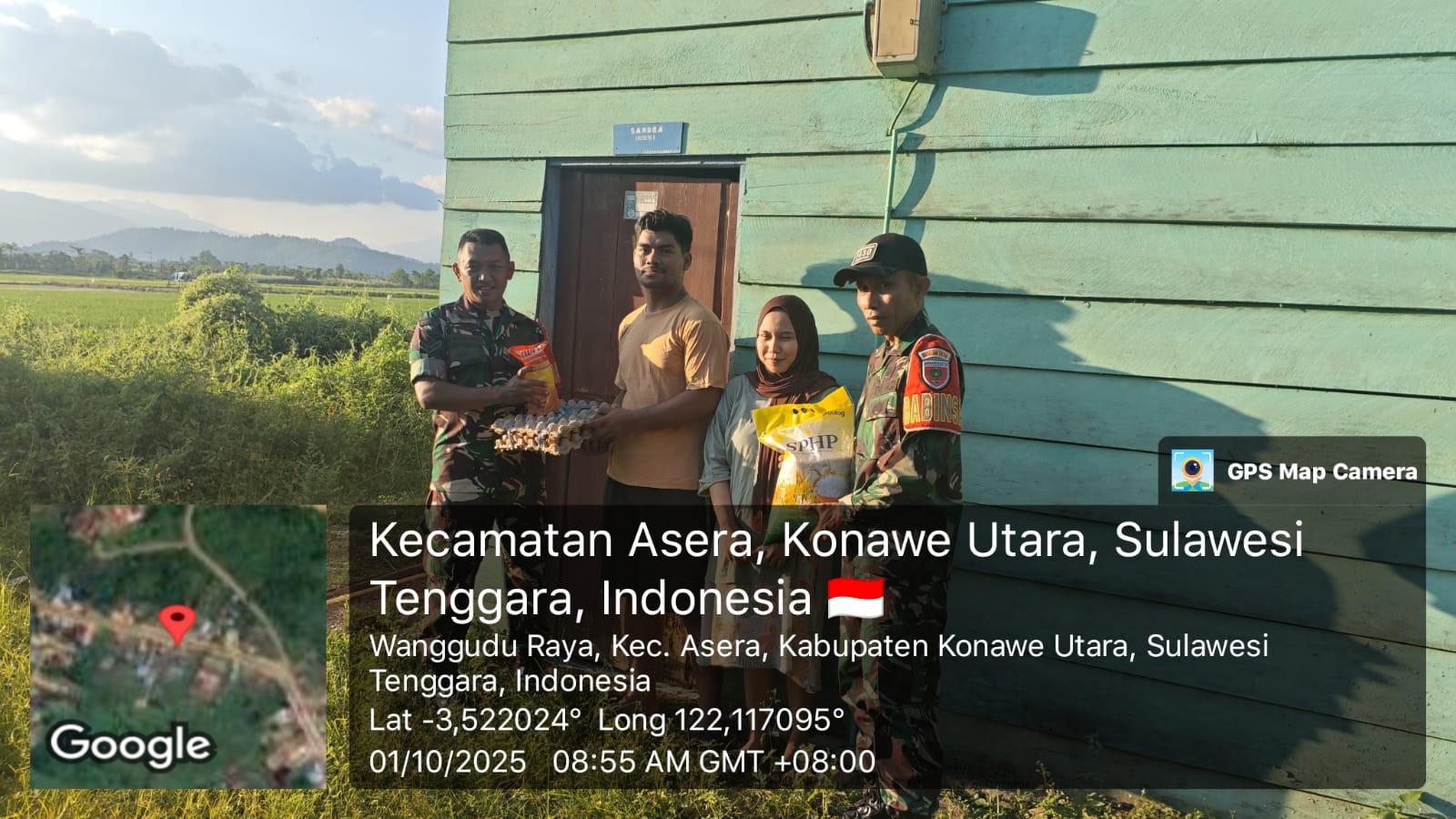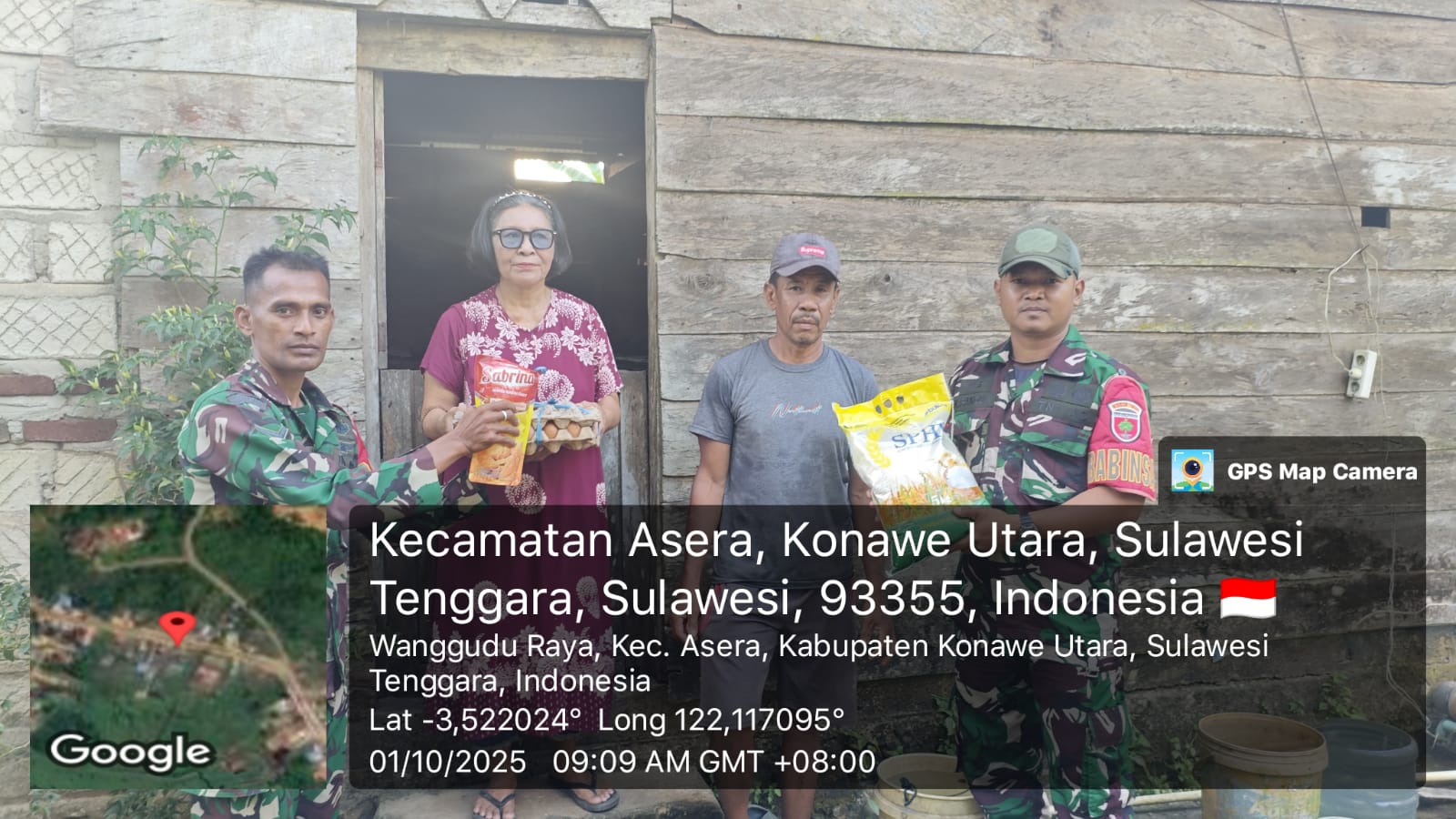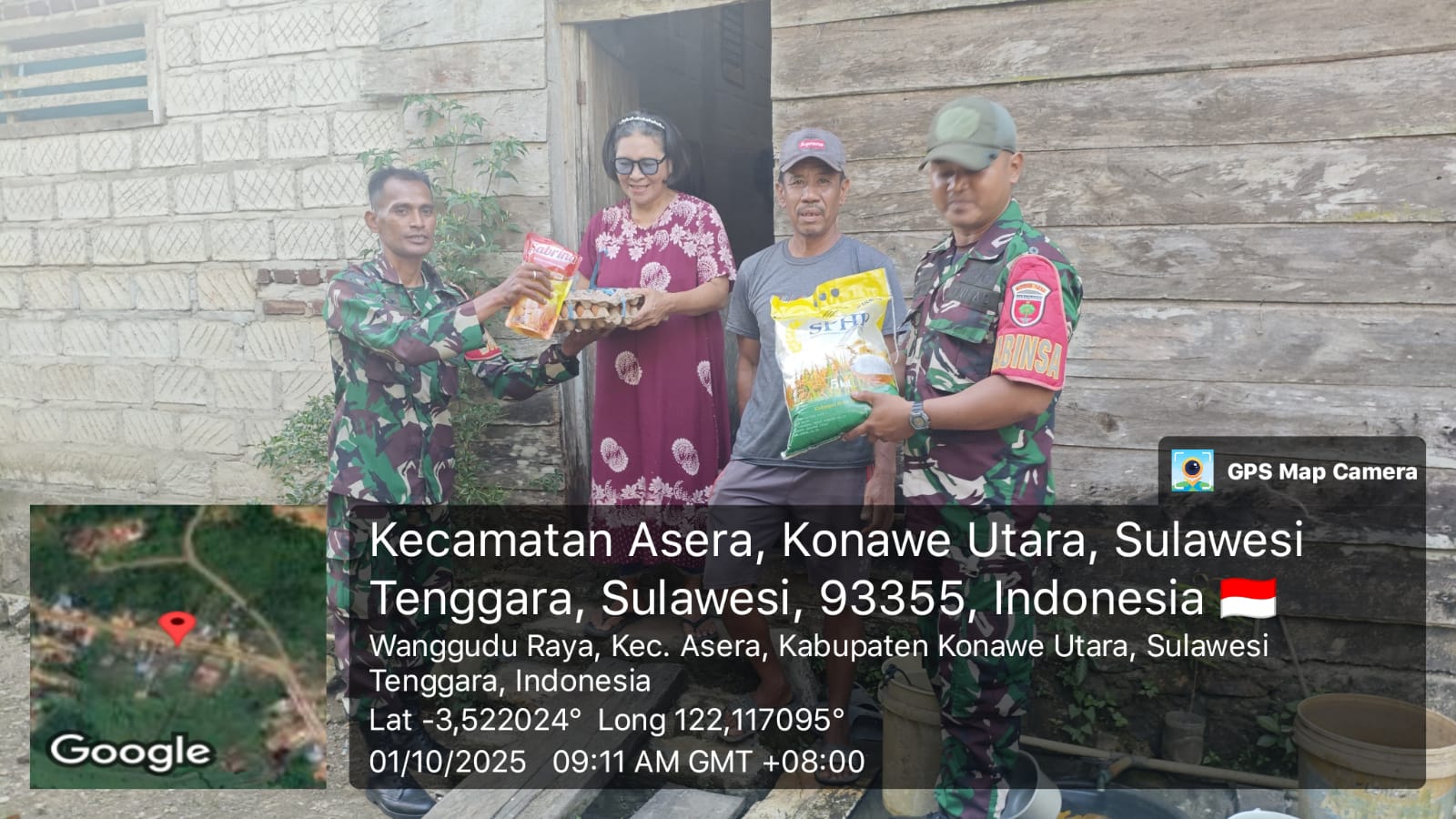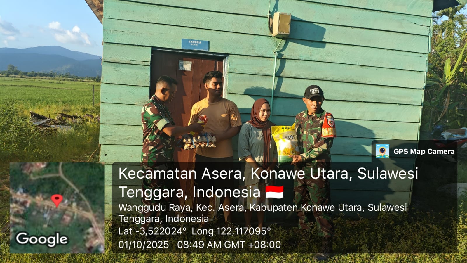 Kegiatan tersebut dipimpin langsung oleh Babinsa Koramil 1430-02/Asera, antara lain Serda Ld. Hasrat, Serda Fajar, Serda La Arman, serta Kopda Randuk yang turun langsung menyapa dan menyerahkan bantuan kepada warga penerima.