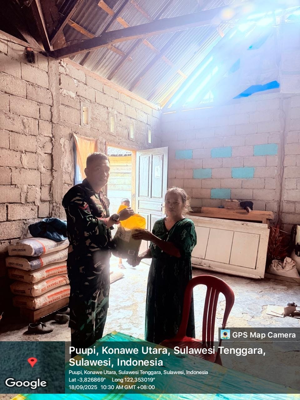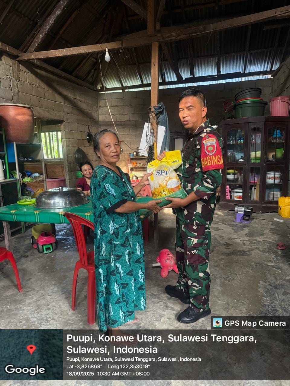 Kegiatan yang berlangsung di Desa Puupi, Kecamatan Sawa, ini dipimpin oleh Kopda Ahdar Razak bersama Babinsa setempat. Bantuan sembako berupa beras 5 kg dan telur 1 rak diserahkan kepada warga penerima, salah satunya Ibu Nirma Wati.