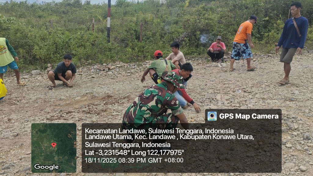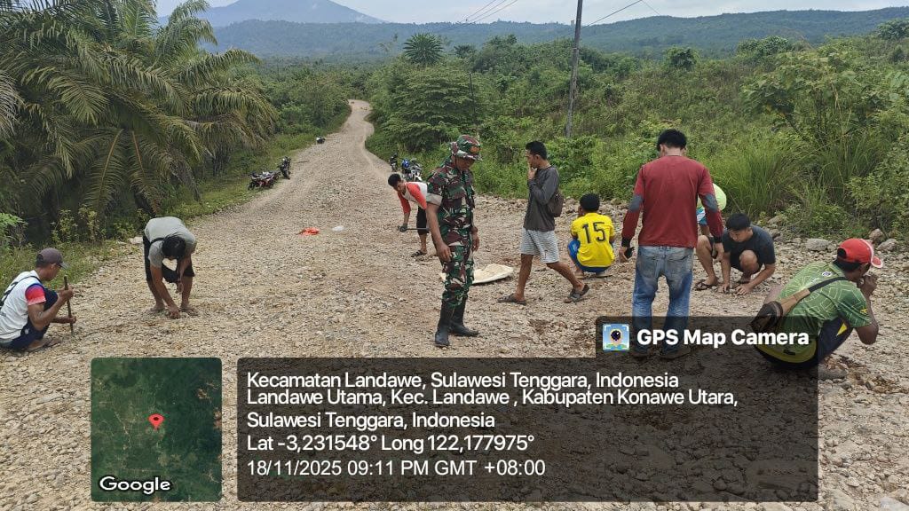 Konawe Utara — Dalam rangka penguatan teritorial dan pembinaan pemberdayaan wilayah, Kodim 1430/Konawe Utara melalui Babinsa Koramil 1430-02/Asera melaksanakan kegiatan Karya Bakti bersama masyarakat di Desa Landawe Utama, Kecamatan Landawe, Kabupaten Konawe Utara, Selasa (18/11/2025).