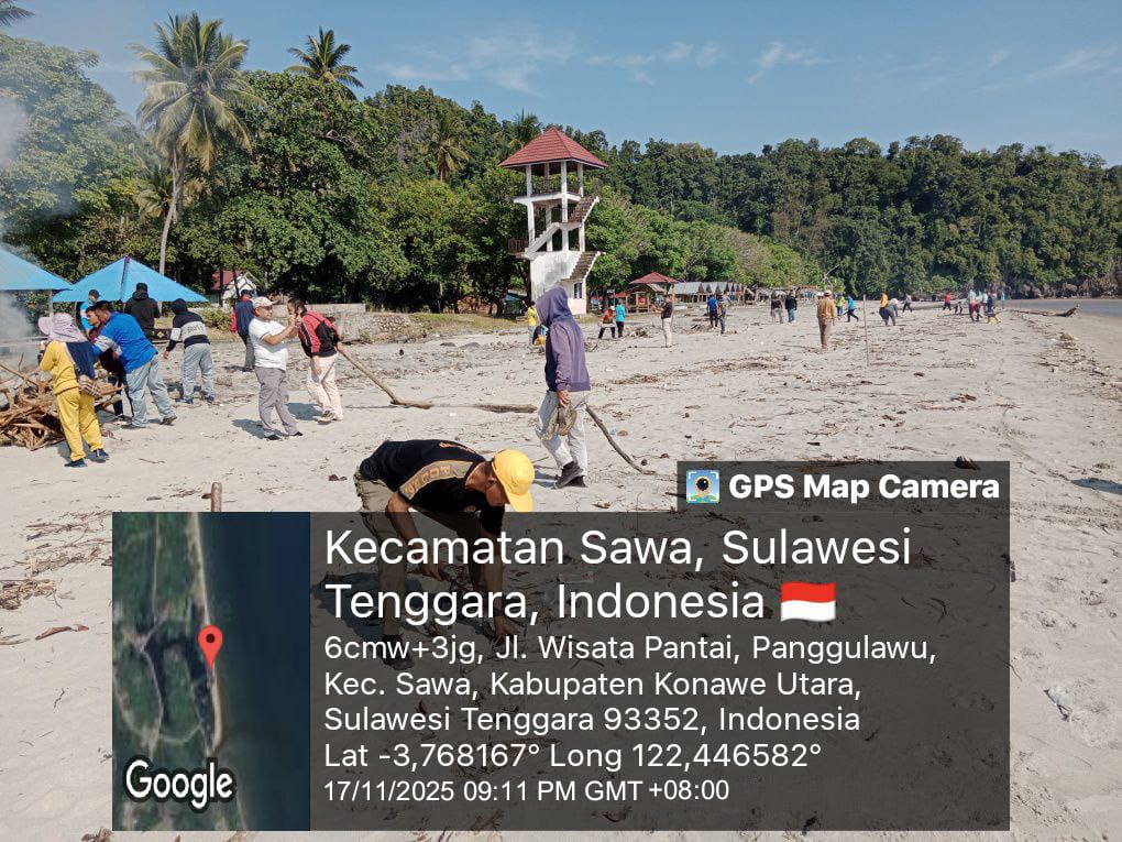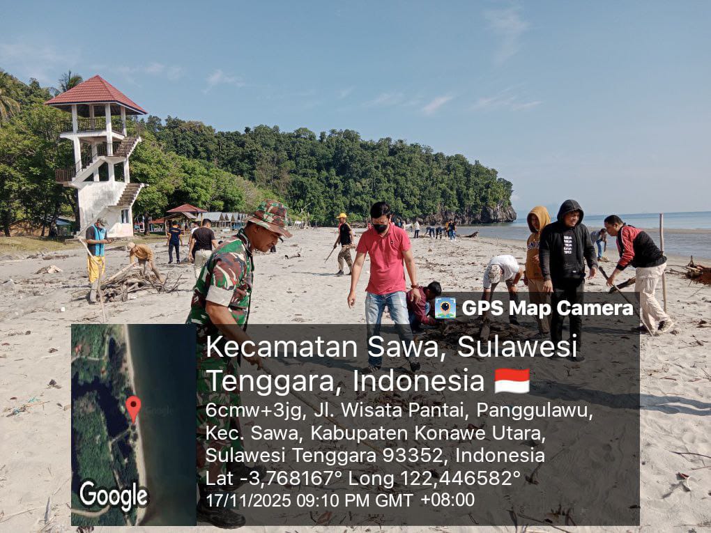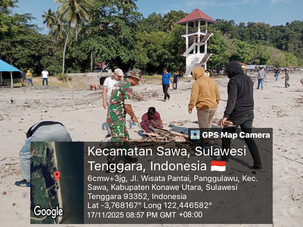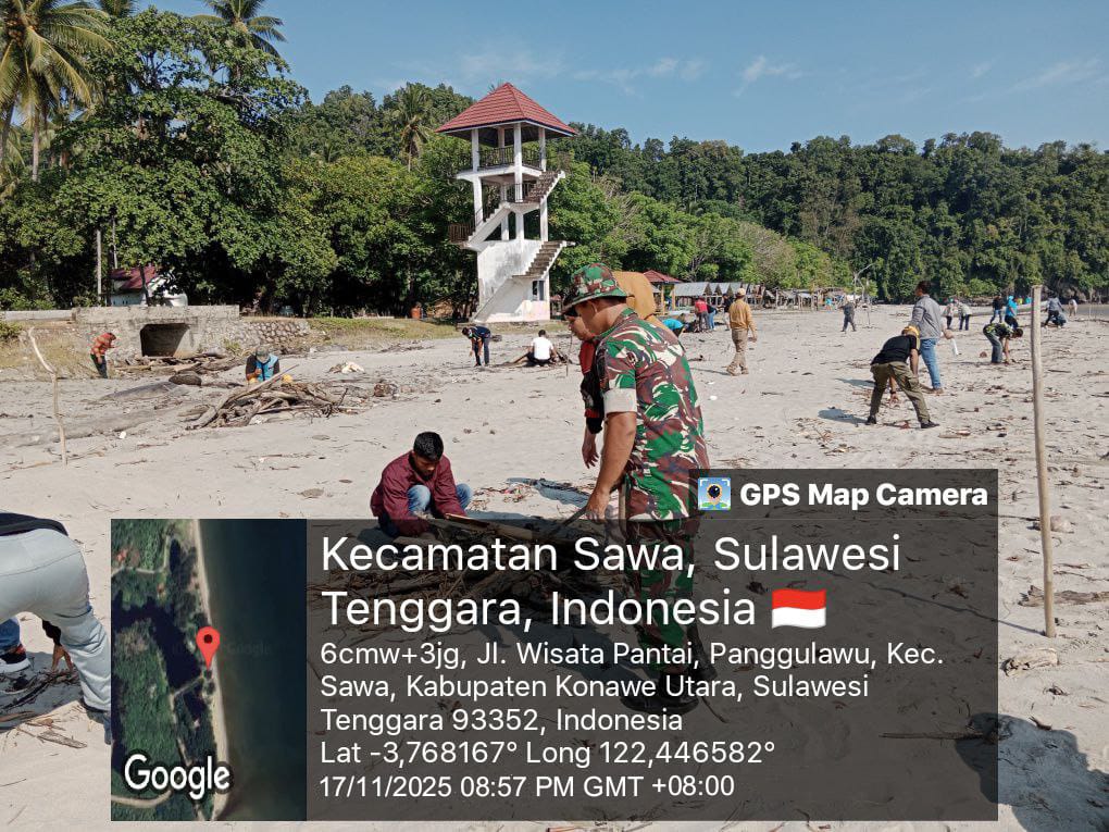 Konawe Utara – Dalam rangka meningkatkan kepedulian masyarakat terhadap kebersihan lingkungan pesisir, Kodim 1430/Konut melalui Babinsa Koramil 1430-01/Lasolo melaksanakan kegiatan Karya Bakti pembersihan Pantai Taipa bersama warga Desa Taipa, Kecamatan Lembo, Kabupaten Konawe Utara, Senin (17/11/2025).