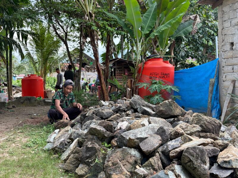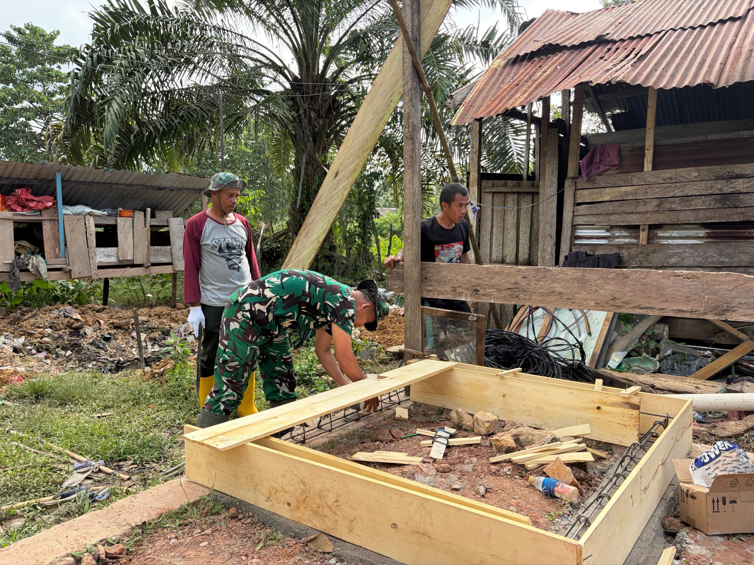 Terlihat di lapangan, seorang anggota TNI bersama warga setempat tengah menyusun rangka besi dan papan cetakan untuk pondasi MCK. Dengan peralatan sederhana dan penuh ketelitian, proses pembangunan dilakukan secara gotong royong, mencerminkan sinergi kuat antara TNI dan rakyat.