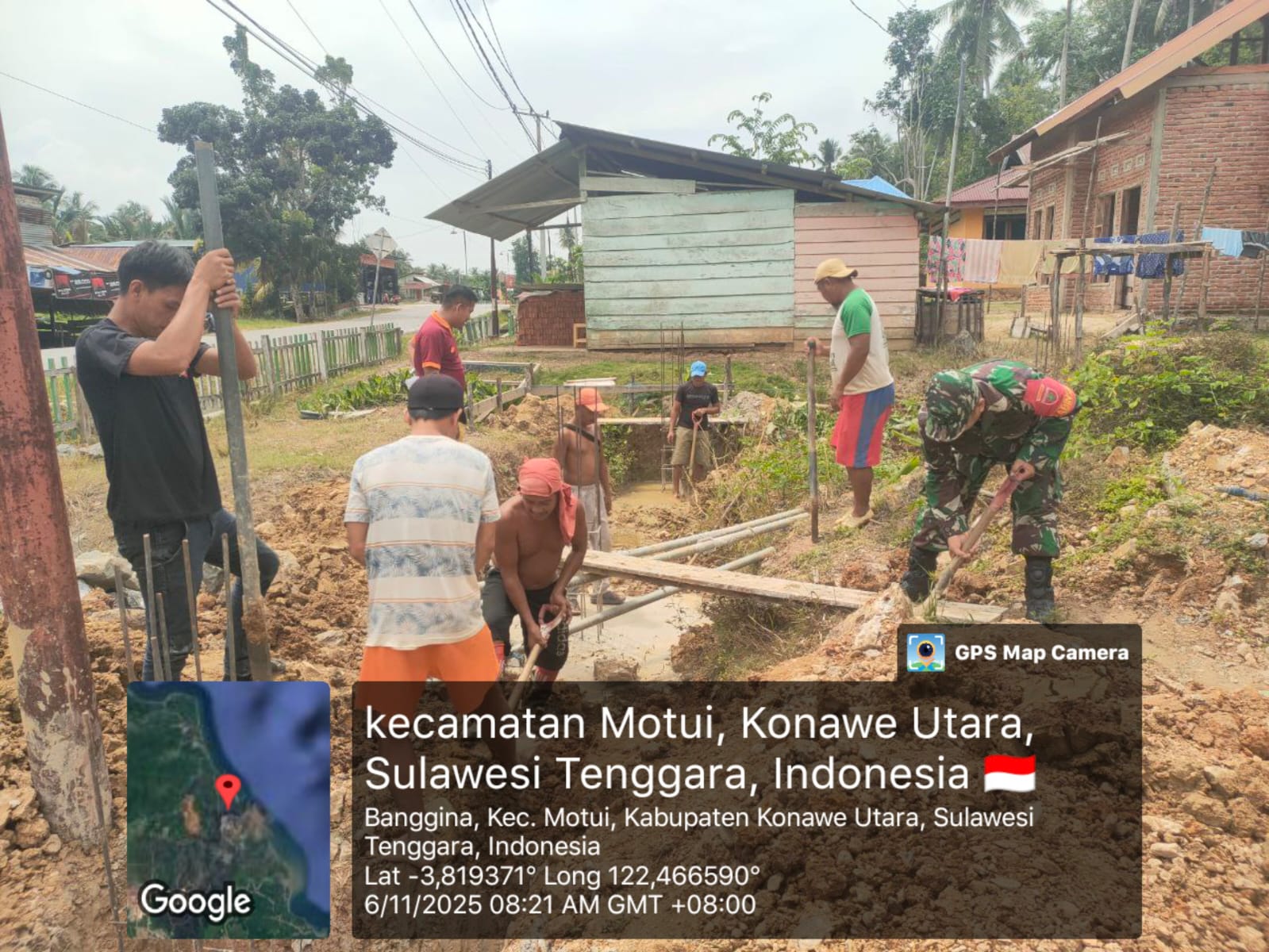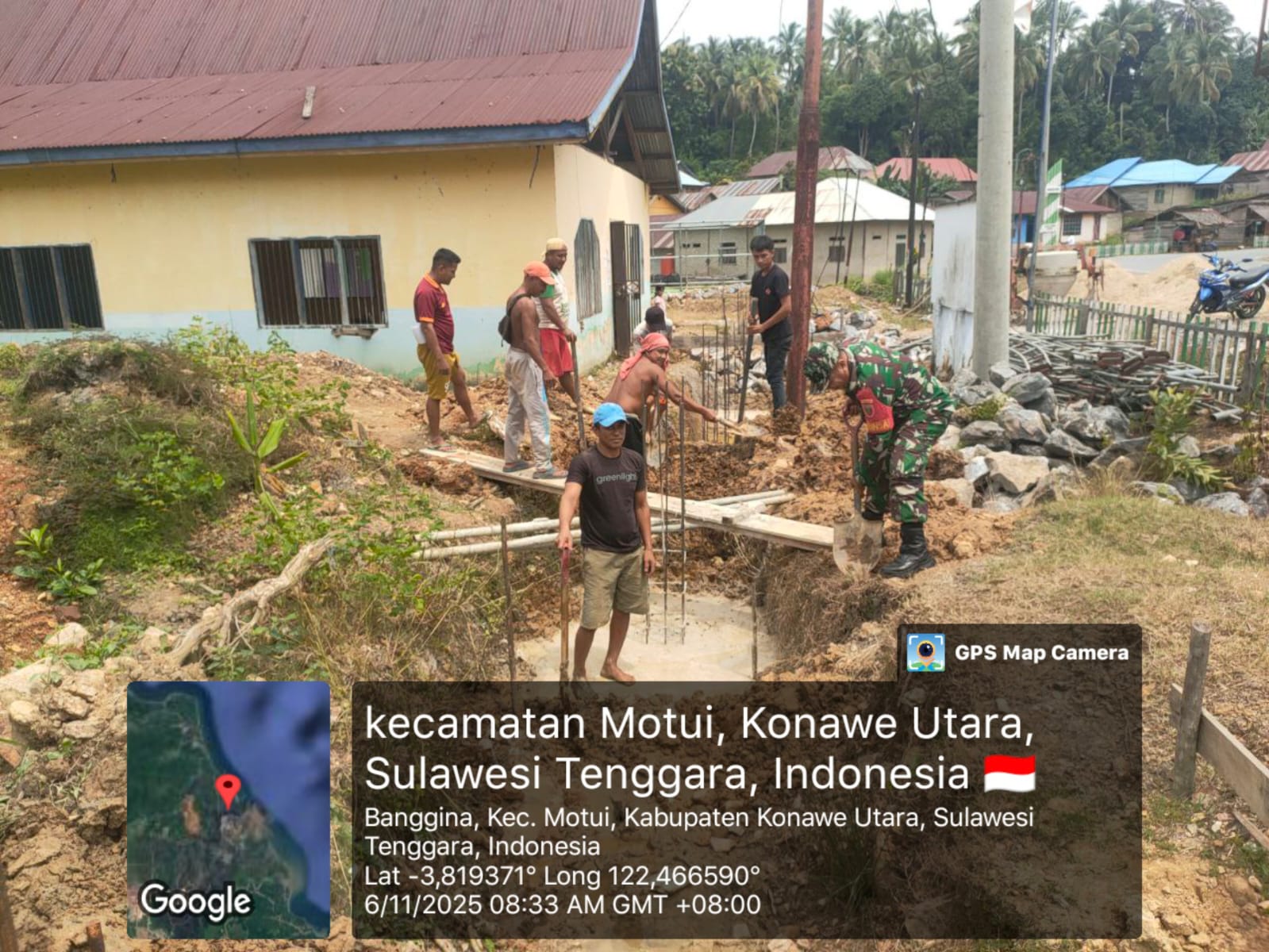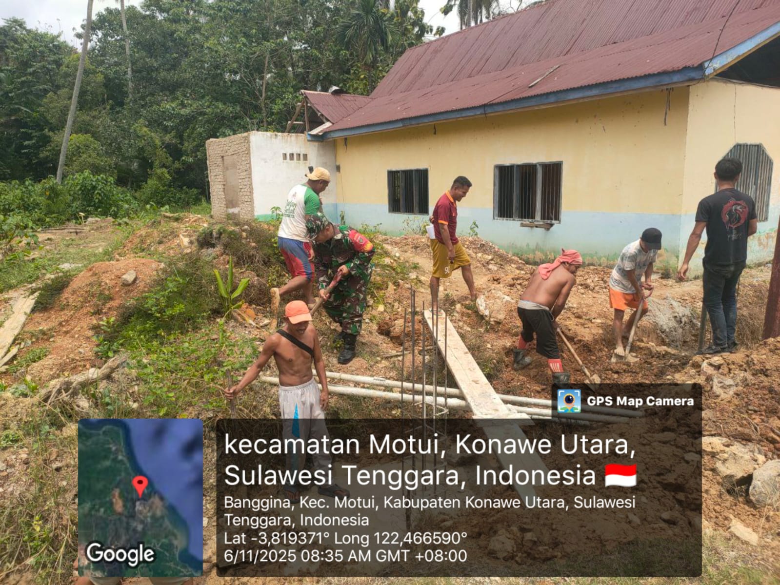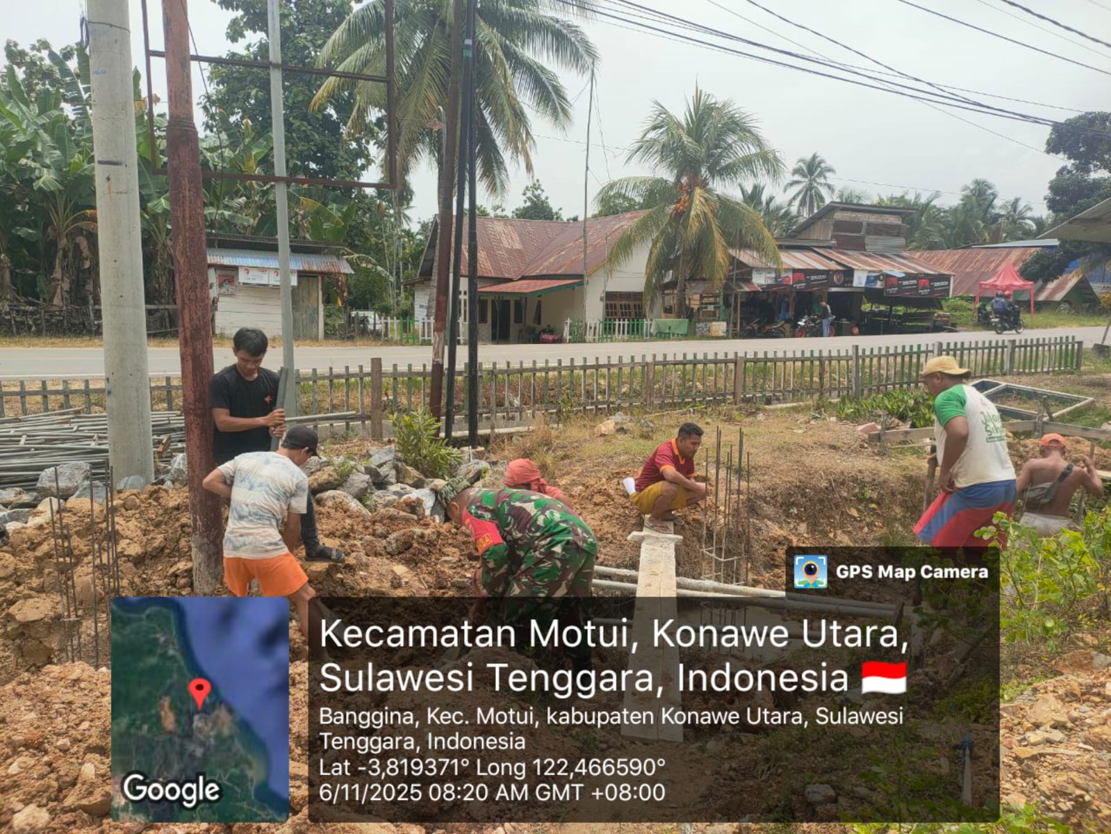 Konawe Utara – Dalam upaya mempererat kemanunggalan antara TNI dan rakyat, Babinsa Koramil 1430-01/Lasolo, Serma Ayub M., bersama warga Desa Banggina, Kecamatan Motui, melaksanakan kegiatan Karya Bakti dengan sasaran pembangunan dan pengecoran tempat ibadah di wilayah setempat Kamis (6/11/2025)